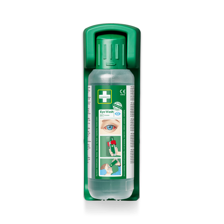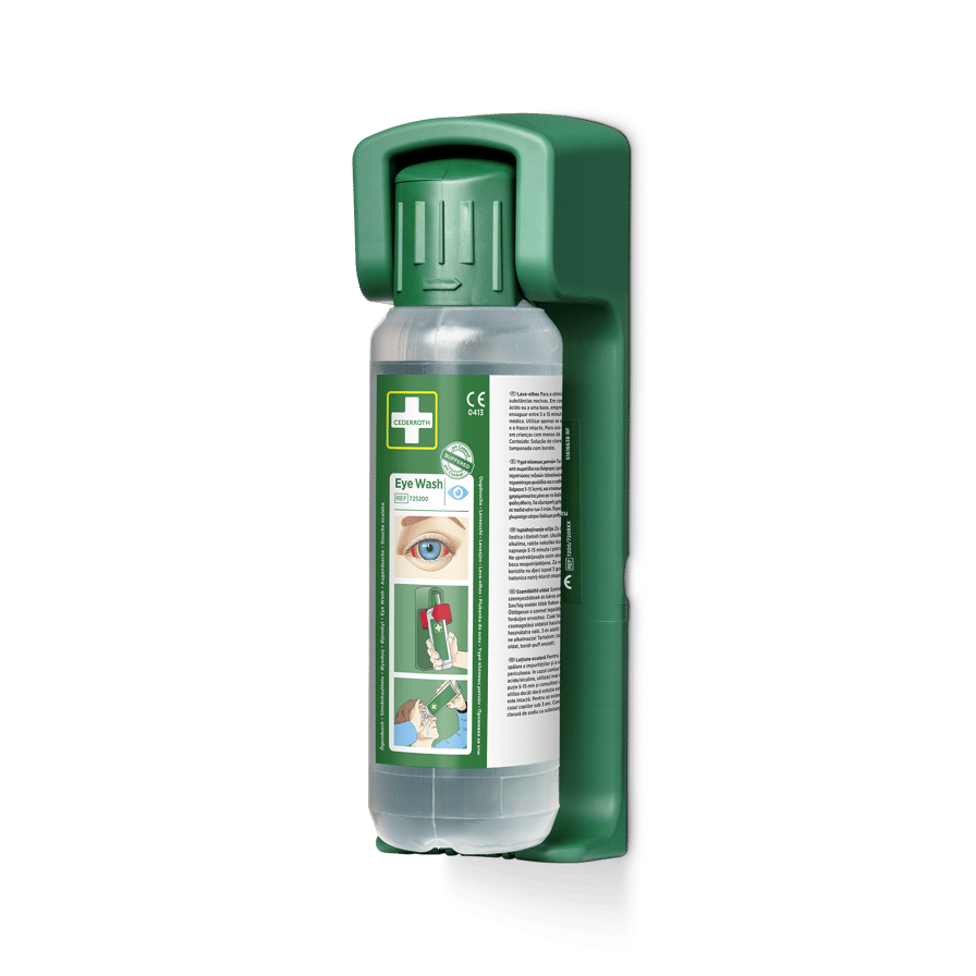 Robust og praktisk vægholder til Cederroth Øjenskyl 500 ml (REF 725200). Med vægholderen får flasken en fast plads, så alle ved, hvor den er. Flasken sidder fastlåst i vægholderen og åbnes automatisk, når den drejes ud af holderen – øjenskylning kan påbegyndes med det samme. Kan placeres på flere forskellige måder og er derfor velegnet til alle arbejdspladser og lokaler. Oplyst instruktionsskilt medfølger.