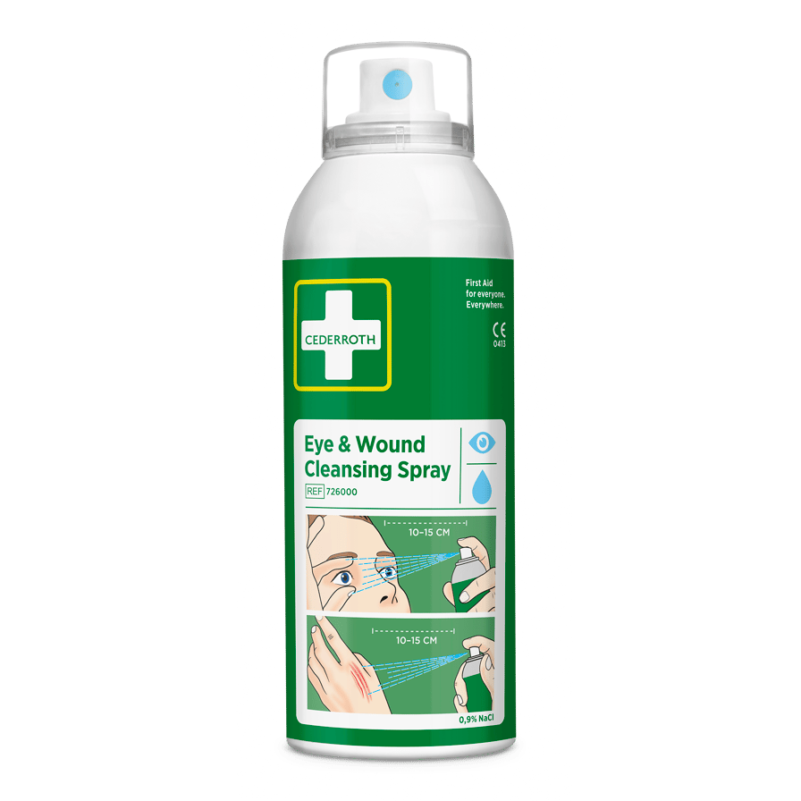 Spray til at rense og skylle støv og snavs væk fra øjne og sår. Sprayen giver en blød væskestrøm og har en samlet skylletid på cirka 5 minutter, praktisk til f.eks. hudafskrabninger, der skal rengøres grundigt. Sprayen kan bruges flere gange og er steril til sidste dråbe. Ved akutte øjenskader, f.eks. ved stænk af ætsende stoffer, bør der anvendes en bufret øjenskyl som Cederroth Eye Wash. Eye & Wound Cleansing Spray kan i disse situationer anvendes under transport til hospitalet efter indledende skylning med en bufret øjenskyllevæske. Flaskens design betyder, at den kan bruges i alle retninger, selv på hovedet. Flasken kan opbevares både stående og liggende. Produktfordele: Kombineret øjen-og sårskyl. Passer i førstehjælpsstationen. Kan bruges flere gange. Steril til sidste dråbe.