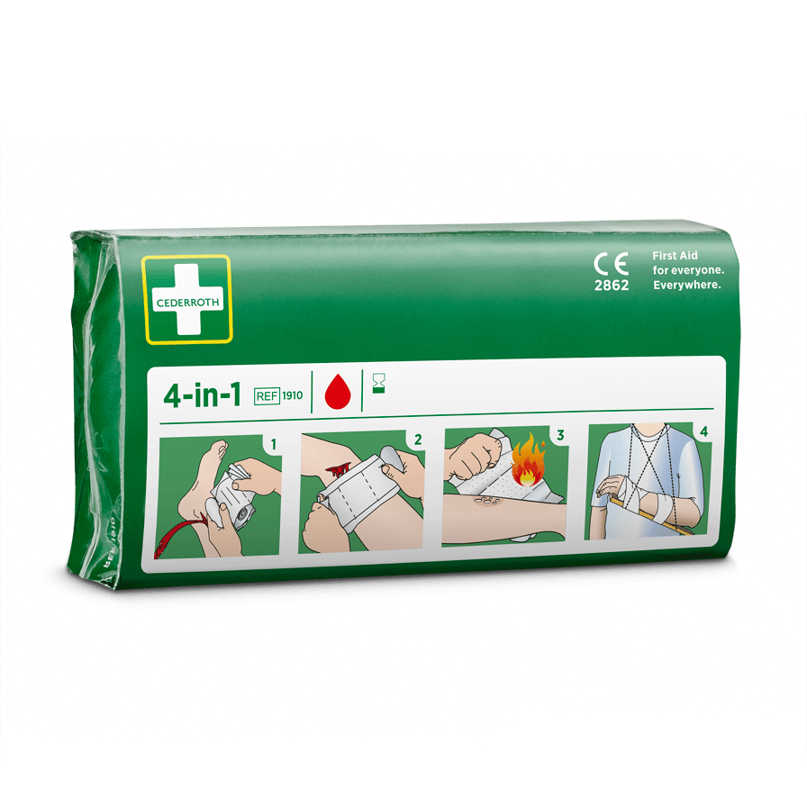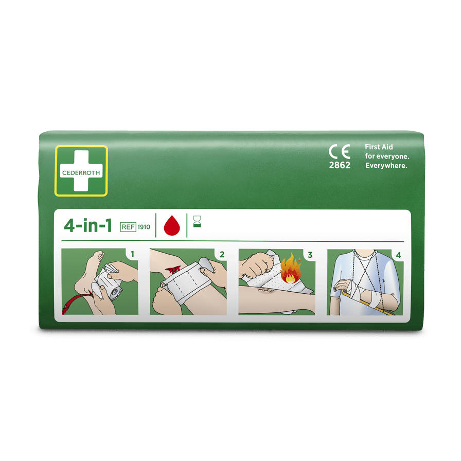 Cederroth 4-i-1 Blodstoppere er en steril universalforbinding med fire funktioner: Trykforbinding til kraftige blødninger, dækforbinding til overfladiske sår, brandsårsforbinding gennem kompressens sårvenlige overfladelag samt midlertidig støtteforbinding.