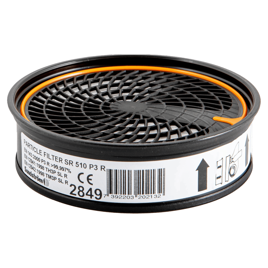 SR 510, P3 R* partikelfilteret er designet til brug i Sundström halvmasker, helmasker og SR 500/SR 500 EX/SR 700 blæser. Filteret giver beskyttelse mod alle typer partikelforurenende stoffer. Partikelfilteret kan nemt kombineres med gasfiltre fra Sundströms filtersortiment for også at yde beskyttelse Mod gasser og dampe, f.eks. under spraymaling. Partikelfilteret bør kombineres med forfilter SR 221, som derved forlænger partikelfiltrets levetid. SR 500/SR 500 EX blæseren bør altid bruges med to partikelfiltre eller to kombinerede filtre bestående af gasfiltre og partikelfiltre. *R (genbrugelig): Filteret er beregnet til at blive brugt til mere end et enkelt skift.