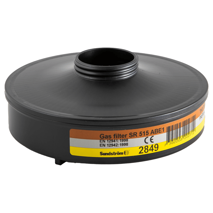 515 ABE1 Gasfilter er beregnet til brug i SR 500/SR 500 EX Turboenhed. Beskyt mod følgende gasser/dampe: Type A beskytter mod organiske gasser og dampe, såsom opløsningsmidler, med kogepunkter > +65 °C. Type B beskytter mod uorganiske gasser og dampe såsom klor, hydrogensulfid og hydrogencyanid. Type E beskytter mod sure gasser og dampe, såsom svovldioxid og hydrogenfluorid. SR 500/SR 500 EX Turboenhed skal altid anvendes med to partikelfiltre eller to kombinationsfiltre bestående af gasfiltre og partikelfiltre.