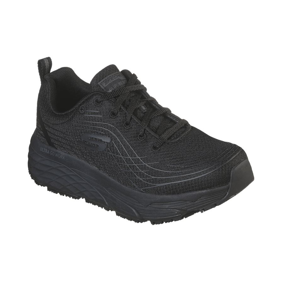Max Cushioning Work Shoe har en overdel i mesh og sorte detaljer. Skechers Air Cooled Memory Foam indersål giver god støddæmpning. Max Cushioning-mellemsålen er designet til at give den bedste komfort, og en skridsikker ydersål gør dette til en god arbejdssko.
