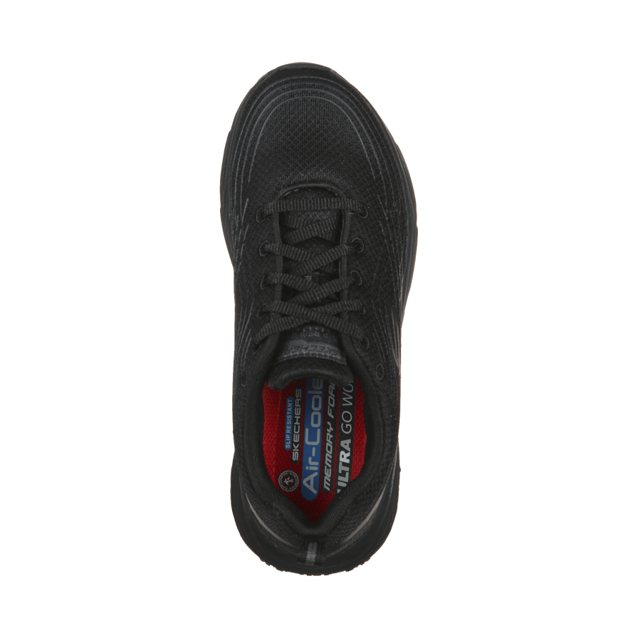 Max Cushioning Work Shoe har en overdel i mesh og sorte detaljer. Skechers Air Cooled Memory Foam indersål giver god støddæmpning. Max Cushioning-mellemsålen er designet til at give den bedste komfort, og en skridsikker ydersål gør dette til en god arbejdssko.