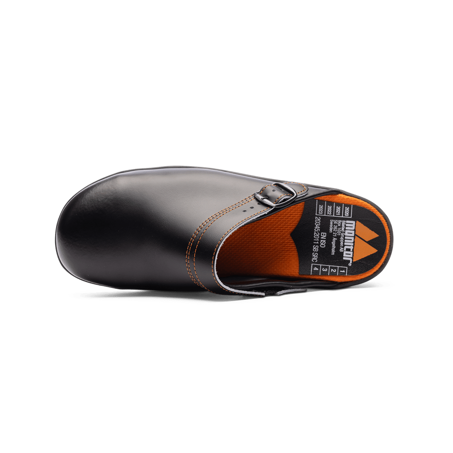 Monitor Ymer Safety Clog er en klassisk sikkerhedstræsko med en slidstærk overdel i PU-belagt læder og en SRC-certificeret skridsikker sål. Indersålen er ergonomisk designet og dækket af fugtabsorberende Cambrelle-tekstil.