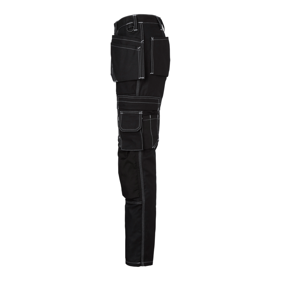 Håndværkerbukser til kvinder med tilpasset ben og CORDURA®-knælommer. Har to forlommer, to baglommer og løse sømlommer, som alle er forstærket med CORDURA®. Udstyret med flere praktiske lommer og et justerbart hammerholder