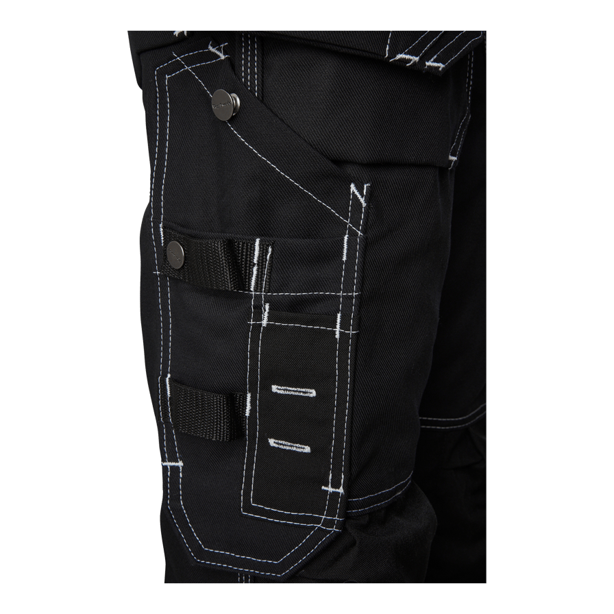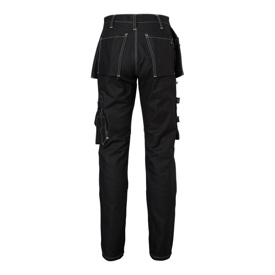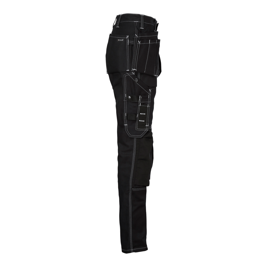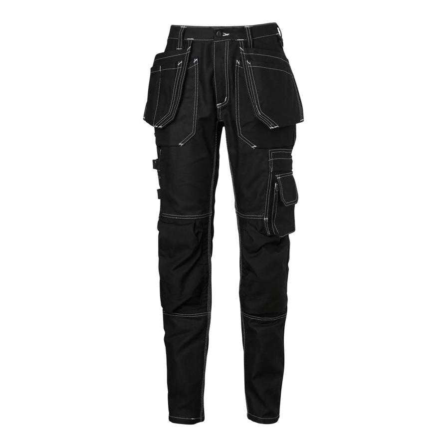 Håndværkerbukser til kvinder med tilpasset ben og CORDURA®-knælommer. Har to forlommer, to baglommer og løse sømlommer, som alle er forstærket med CORDURA®. Udstyret med flere praktiske lommer og et justerbart hammerholder
