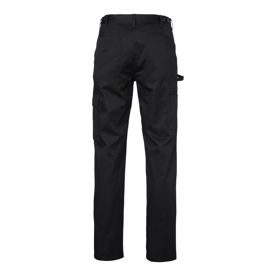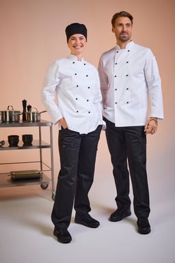 Enzo Chef’s Trousers er en klassisk herremodel med fast linning og stropper i siderne, der kan justere taljevidden. Kokkebukserne har skrå lommer foran, baglommer og benlommer. Højre benlomme har en pincetstrop, og venstre benlomme har klap. Bukserne har en ekstra bred kant for at kunne forlænge bukserne med 5 cm.