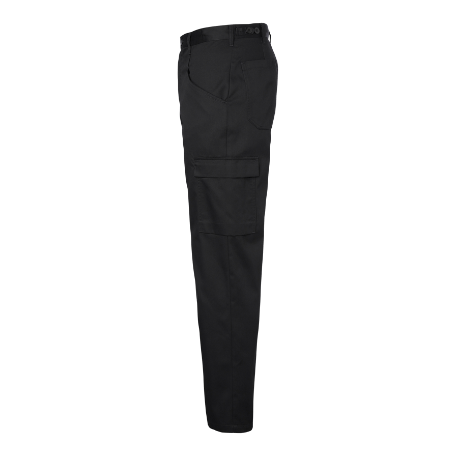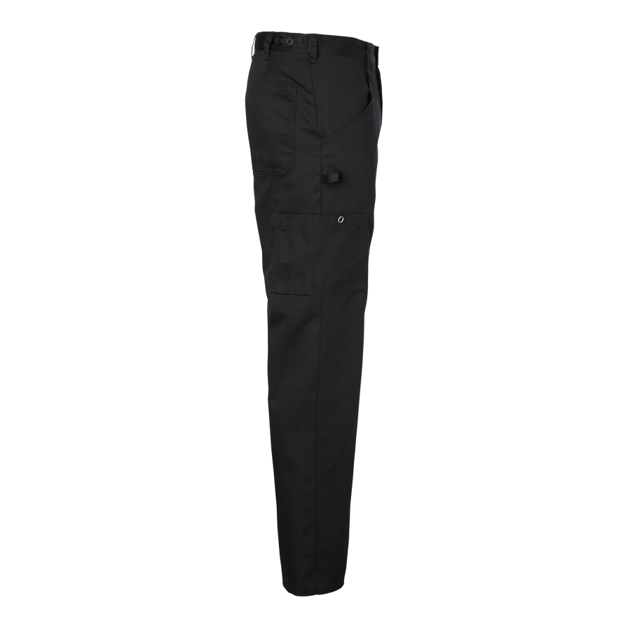 Enzo Chef’s Trousers er en klassisk herremodel med fast linning og stropper i siderne, der kan justere taljevidden. Kokkebukserne har skrå lommer foran, baglommer og benlommer. Højre benlomme har en pincetstrop, og venstre benlomme har klap. Bukserne har en ekstra bred kant for at kunne forlænge bukserne med 5 cm.