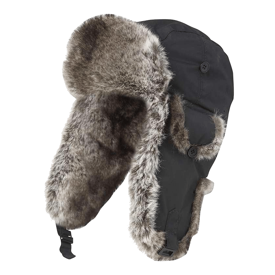 Pelsbeklædt hue med quiltet for, justerbar hagerem og øreklapper, der kan foldes op.