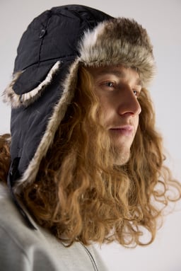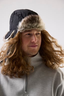 Pelsbeklædt hue med quiltet for, justerbar hagerem og øreklapper, der kan foldes op.