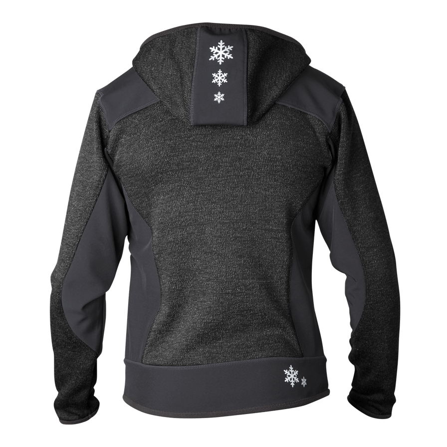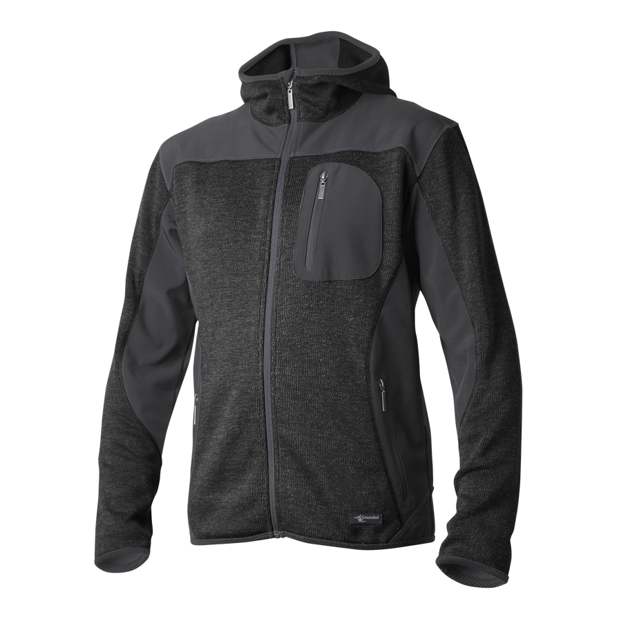 Fuld kæde foran med kædebeskyttelse. En brystlomme med lynlås. To forlommer med lynlås. Strikket fleece forstærket med softshell.