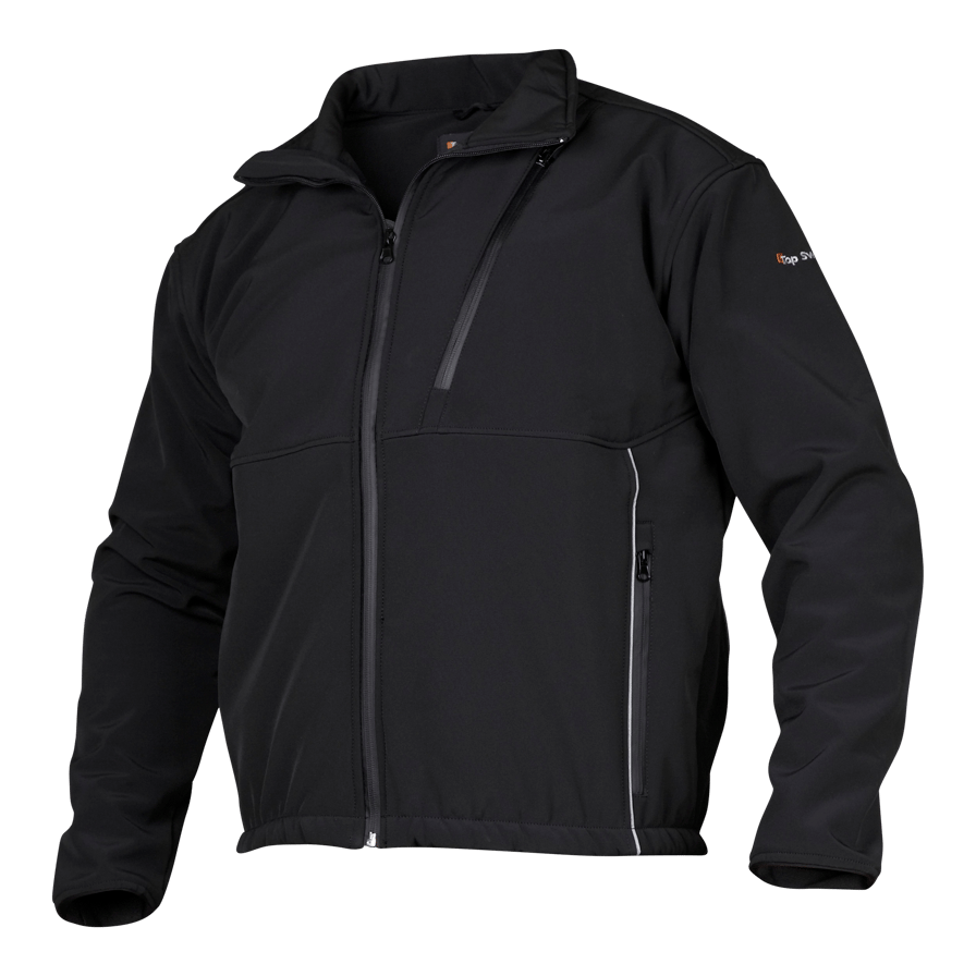Softshelljakke med lynlås, to forlommer, en brystlomme med telefonlomme og to store inderlommer.