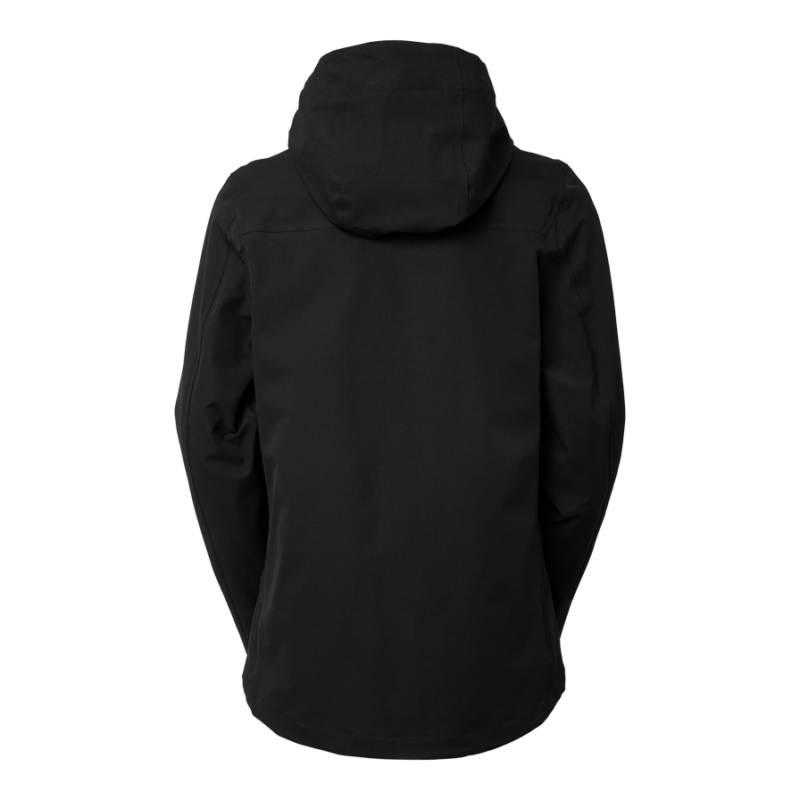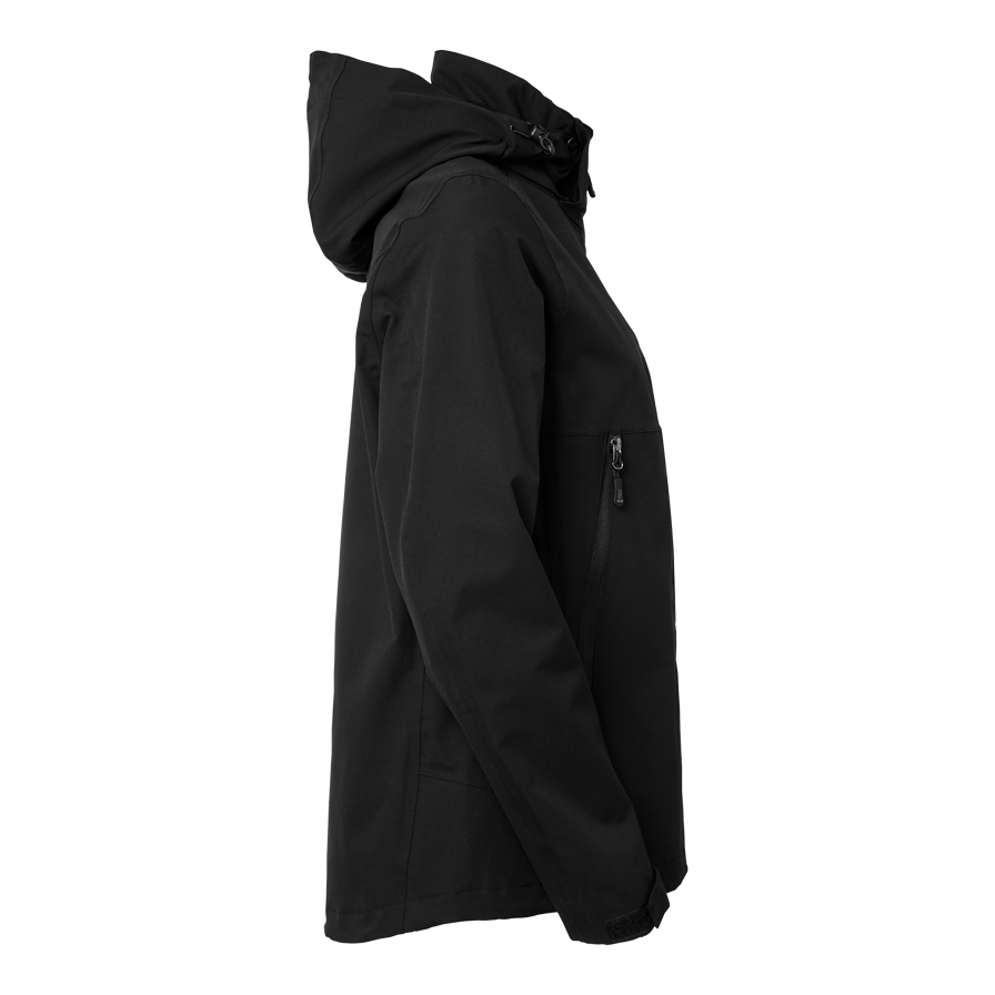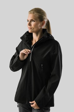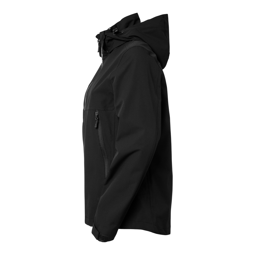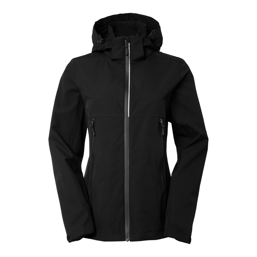 Vind- og vandafvisende skaljakke damepasform med tapede sømme og vandtæt lynlås med reflekterende detaljer. Blødt materiale med mekanisk stretch. Aftagelig hætte og justerbare manchetter. To sidelommer og en inderlomme med lynlås.