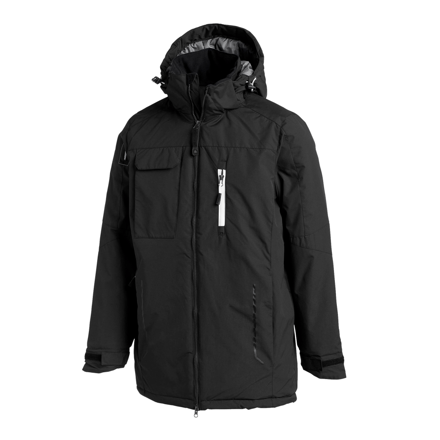 Whittaker Jacket fra Matterhorn er en robust vinterjakke, der er perfekt til kolde og våde forhold. Jakken er lavet af slidstærkt nylon og foret med polyester og er både vindtæt og vandafvisende takket være en PFC-fri Bionic Eco-finish. Den har praktiske funktioner som to sidelommer, to brystlommer og en tovejslynlås, der giver fleksibilitet og brugervenlighed. De justerbare manchetter og den aftagelige, justerbare hætte gør det nemt at tilpasse jakken til vejret. Whittaker Jacket kombinerer funktion og komfort, hvilket gør den ideel til både arbejde og fritid i vintermånederne.