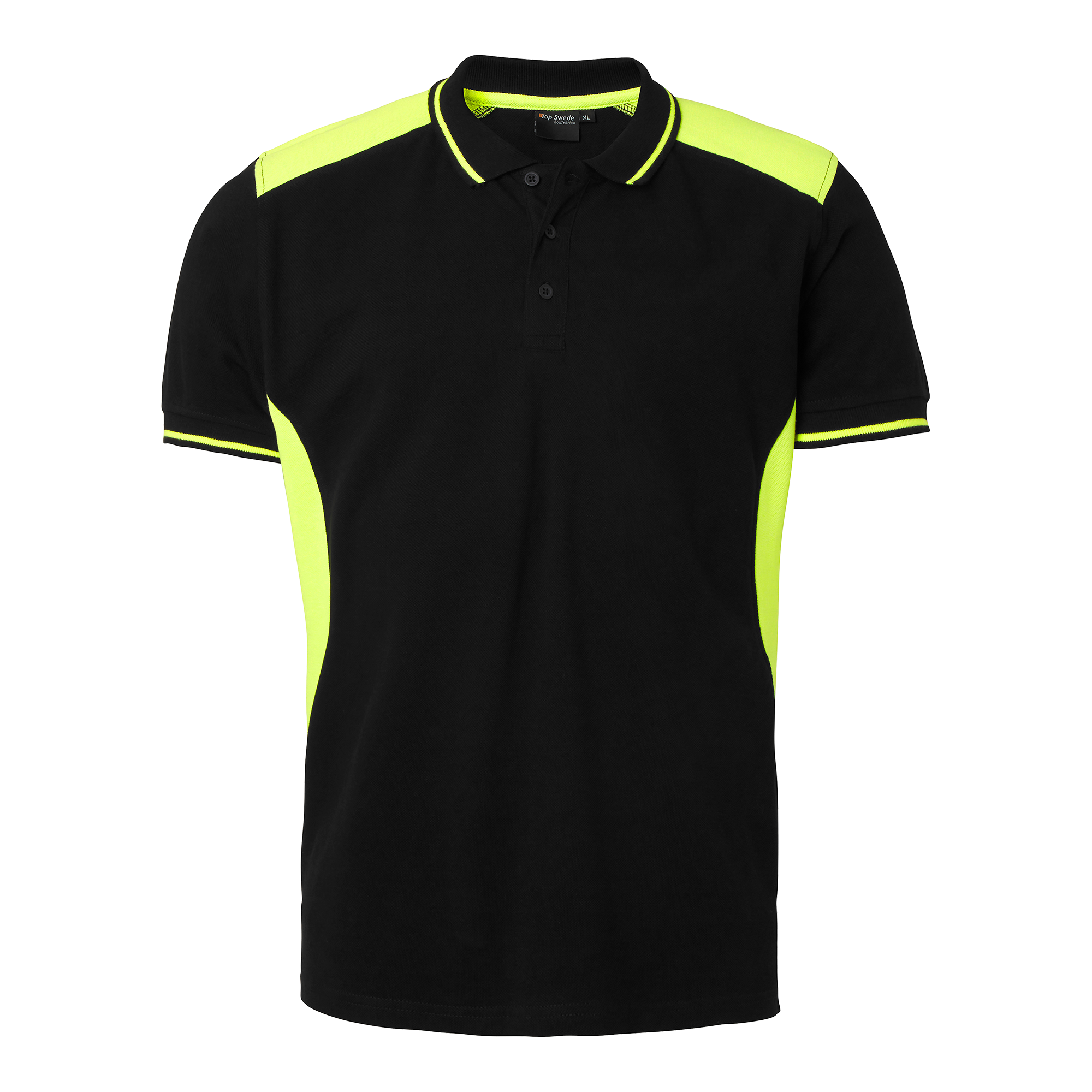Polo t-shirt med øget synlighed fra Top Swede. Ribbet krave og manchetter samt knapstolpe med knapper. Fremstillet af bomuld og polyester for komfort og holdbarhed. Perfekt til arbejde inden for byggeri og industri.