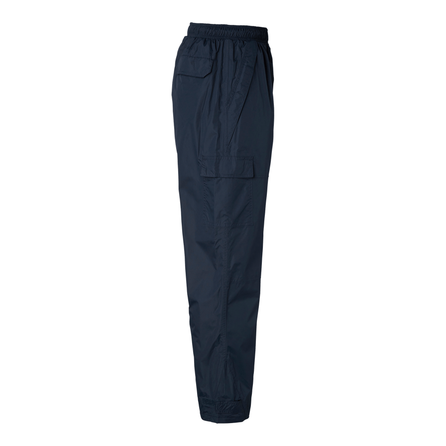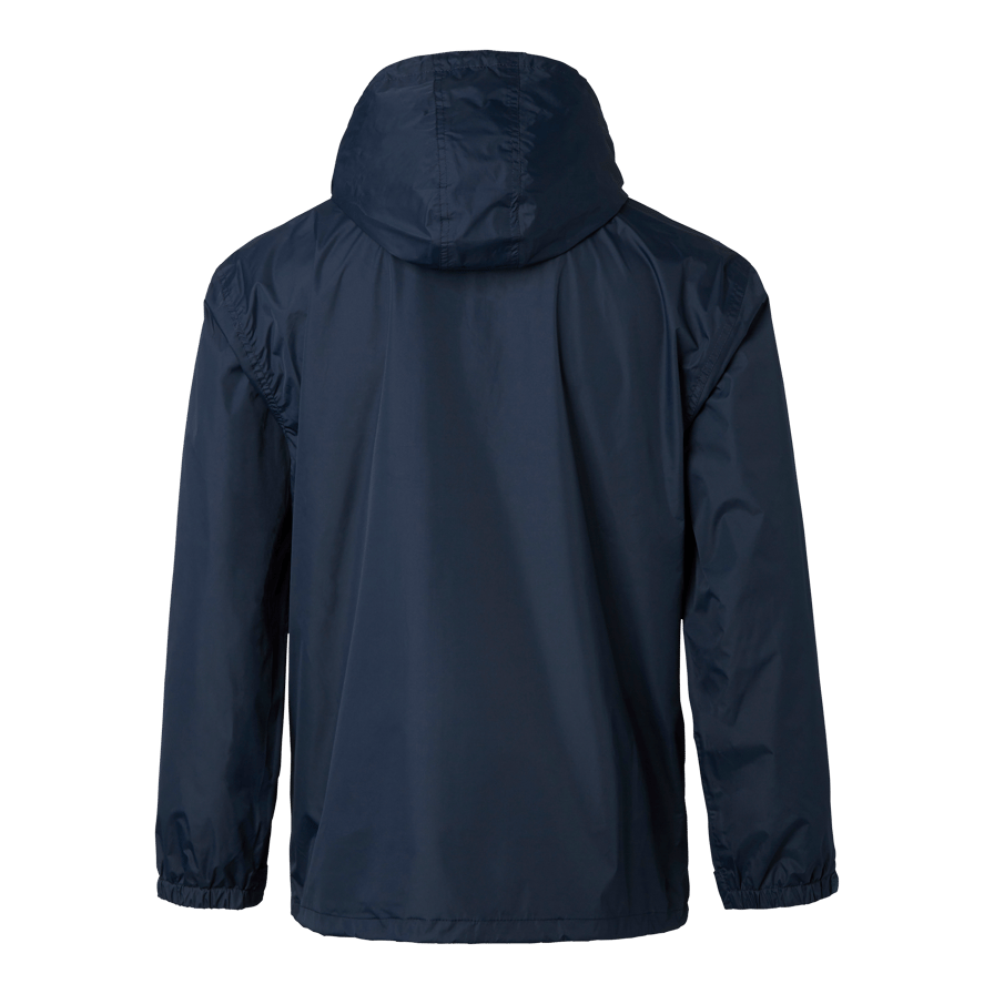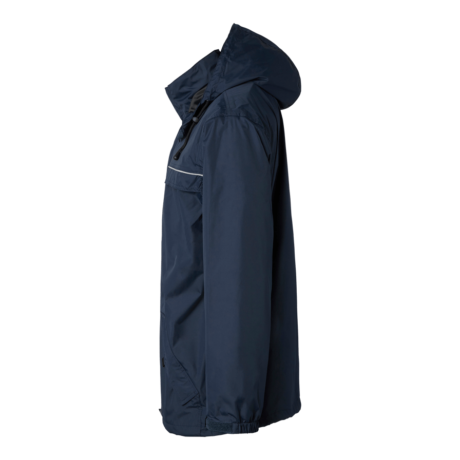 Komplet regntøj med tapede sømme. Jakke med skjult hætte, justerbare manchetter og forneden. To forlommer og en inderlomme med lynlås. Bukser med lommer og velcrolukning samt justerbare forneden