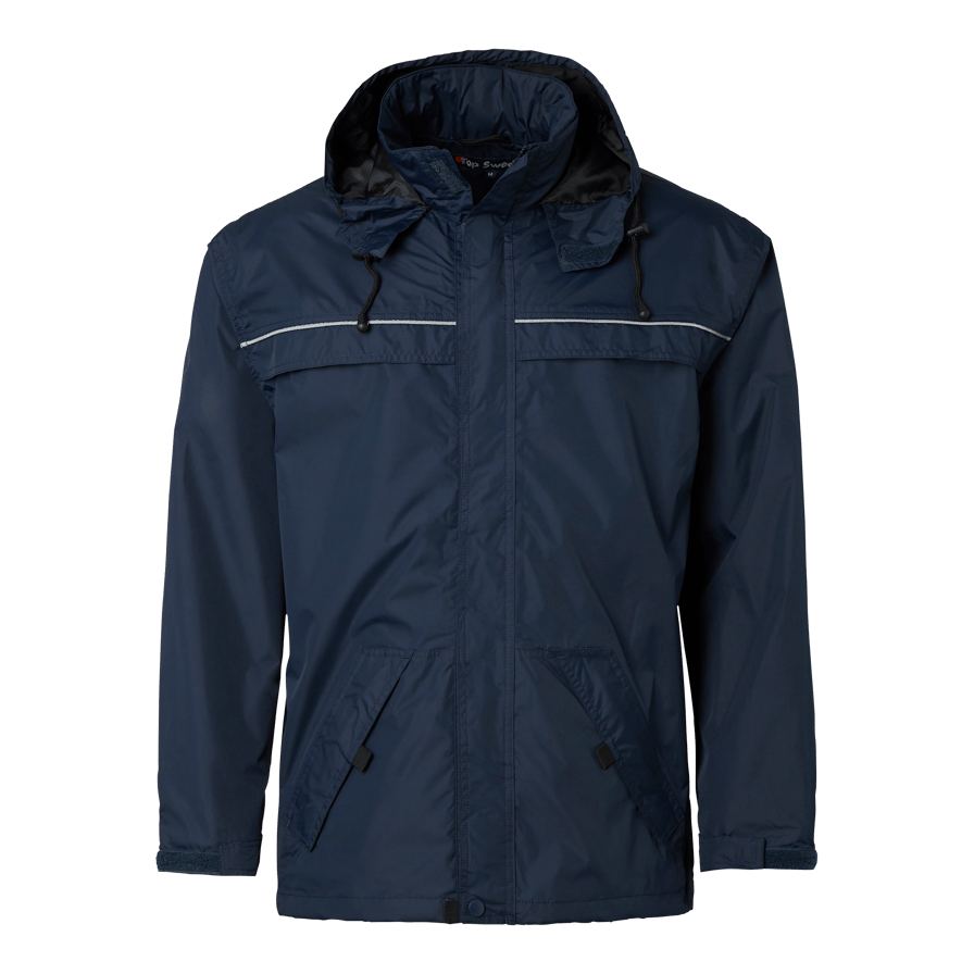Oplev Top Swedes 9496 Rain Suit, et komplet regnsæt, der giver optimal beskyttelse og komfort under alle vejrforhold. Regnsættet er ideelt til fagfolk inden for byggeri og industri og er både vandtæt og slidstærkt takket være PU-belægningen og de tapede sømme. Jakken er udstyret med en skjult hætte, justerbare manchetter med velcro og en justerbar forneden for en skræddersyet pasform. For ekstra funktionalitet har jakken to forlommer med flap og lynlås samt en inderlomme med lynlås og en telefonlomme. Bukserne er designet med praktiske forlommer med velcrolukning, en baglomme med klap og en benlomme med klap og forneden er der velcrolukning der er justerbare, der sikrer, at bukserne sidder godt og holder vandet ude. Med et højt vandsøjletryk og god åndbarhed er 9496 Rain Suit designet til at holde dig tør og komfortabel selv under de mest krævende arbejdsforhold. Vælg dette regnsæt for at få den bedste beskyttelse og funktionalitet på arbejdet.