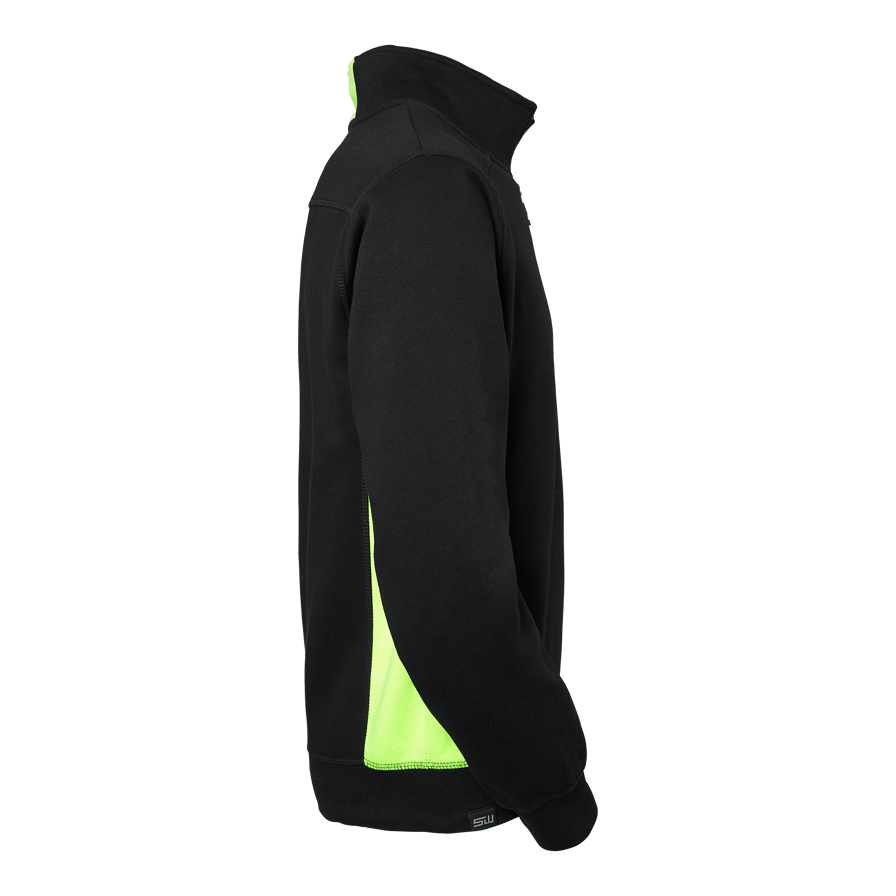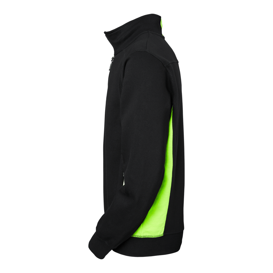 Swaetshirt med gennemgående lynlås, børstet inderside og kontrast farven i sidepaneler. To rummelige lommer foran med lynlås. Ribkante i ærmerne og forneden. Nogle farver har øget synlighed.