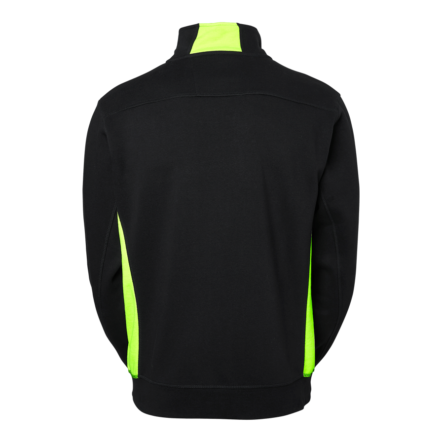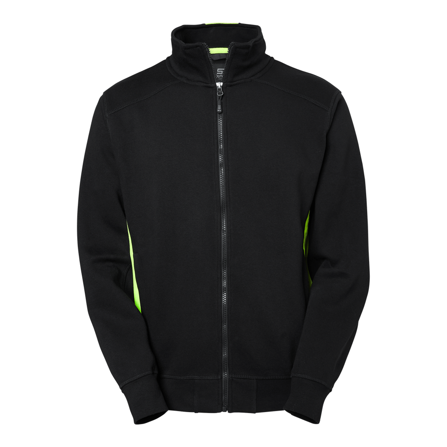 Swaetshirt med gennemgående lynlås, børstet inderside og kontrast farven i sidepaneler. To rummelige lommer foran med lynlås. Ribkante i ærmerne og forneden. Nogle farver har øget synlighed.
