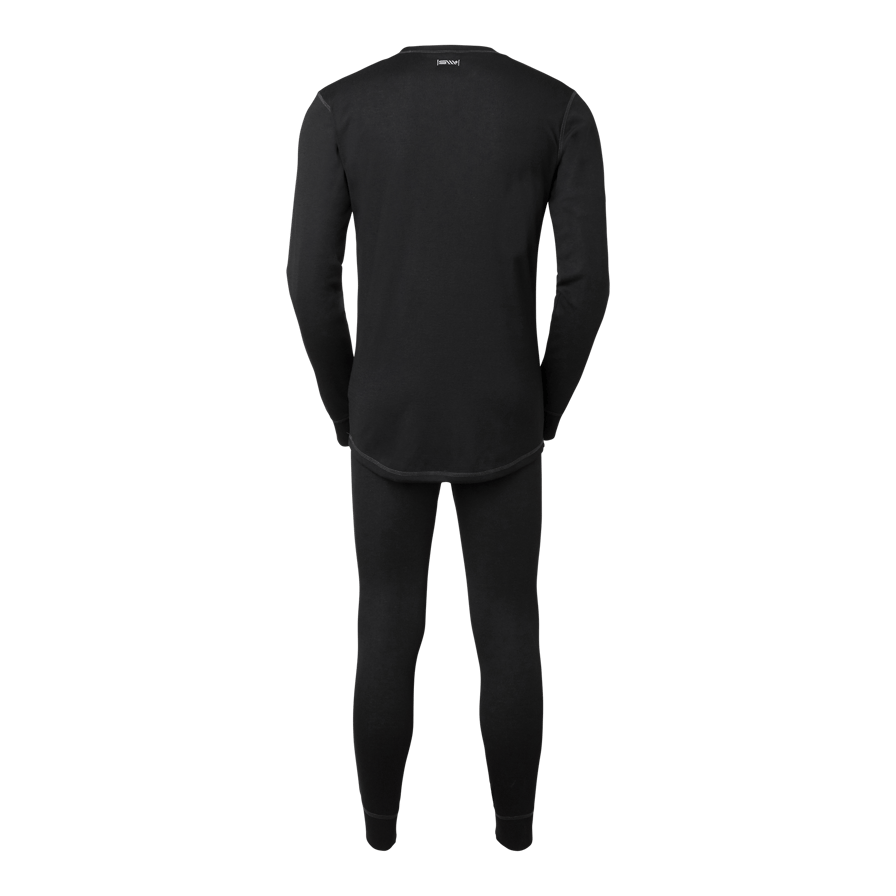 Ensfarvet, funktionelt basislag af polyester med flatlock-sømme i kontrastfarve. Brugt som første lag transporterer den effektivt fugt væk fra kroppen og holder dig tør og veltilpas.