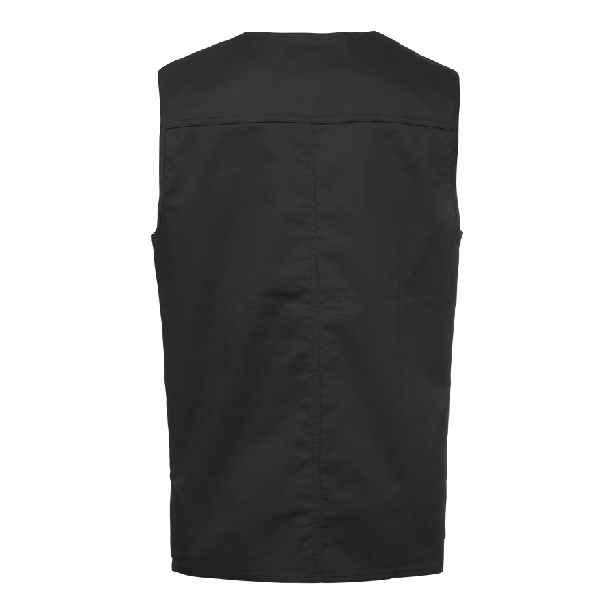 Unisex-vest med slidser forneden og trykknapper foran. Udstyret med en brystlomme og to skrå frontlommer. Ryglængde 73 cm i størrelse M.