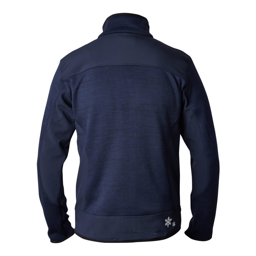 Langer Vorderreißverschluss mit Reißverschlussschutz. Eine Brusttasche mit Reißverschluss. Zwei Vordertaschen mit Reißverschlüssen. Gestricktes Fleece, verstärkt mit Softshell.