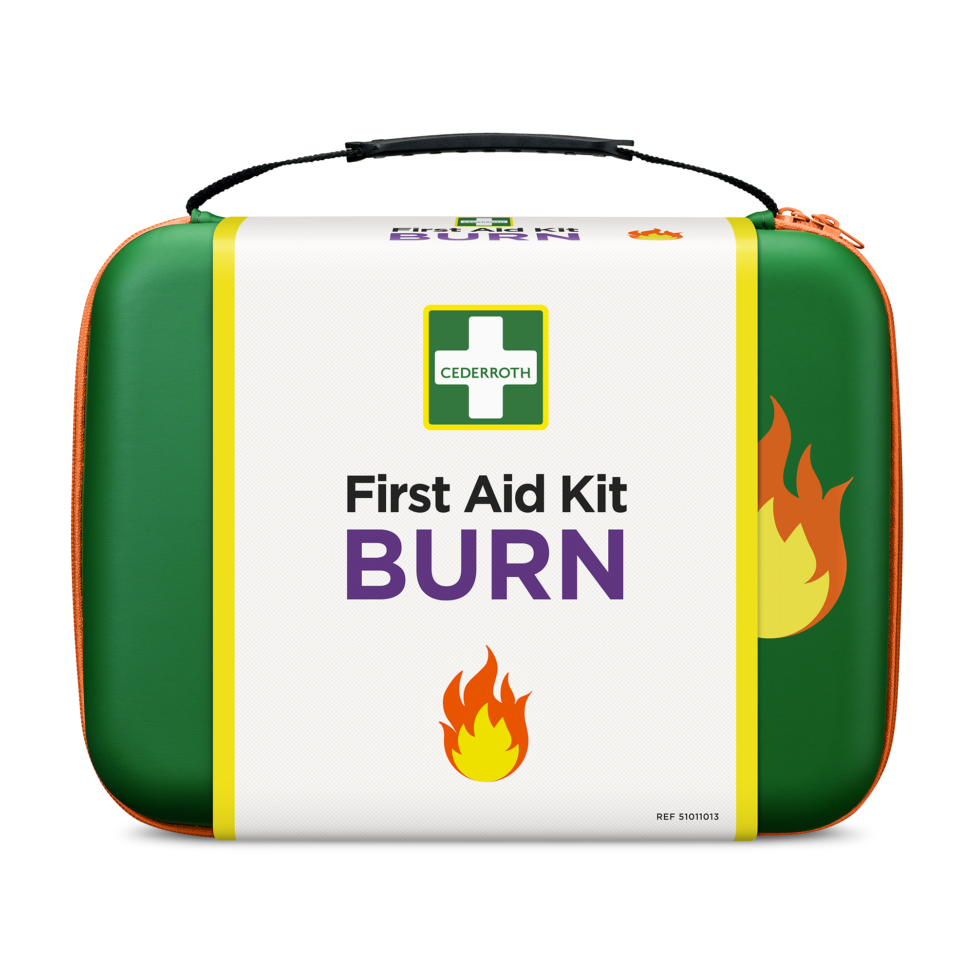 A mobile First Aid Kit with products for handling burns. Burn Gel products provide cooling and pain relief for first and second degree burns. The Burn Gel Dressings come in 3 sizes including a large dressing/face mask 30x40 cm. Easy to use with clear instructions. Case with practical handle. Highly visible with a printed flame symbol and an orange zip. Transparent fold-out plastic pockets provide a clear overview of the contents. Suitable for workplaces with high risk of burns, that handles open fire, flames, hot surfaces, steam, hot fluids and ovens. For example, workplaces in the Construction, Paper, Metal, Chemical and Food industries, but also in the Horeca industry. Contents: 1 x Burn Gel 100 ml (REF 51011005), 1 x Burn Gel Dressing/Face Mask 30x40 cm (REF 51011014), 2 x Burn Gel Dressings 20x20 cm (REF 51011015), 4 x Burn Gel Dressings 10x10 cm (REF 901900), 1 x Cederroth 4-in-1 Bloodstopper (REF 1910), 1 x Fastening Net, 6 x Elastic Fixing Bandages, 2 pairs of Gloves, 1 x Scissors (REF 270002), First Aid and burn injury instructions.