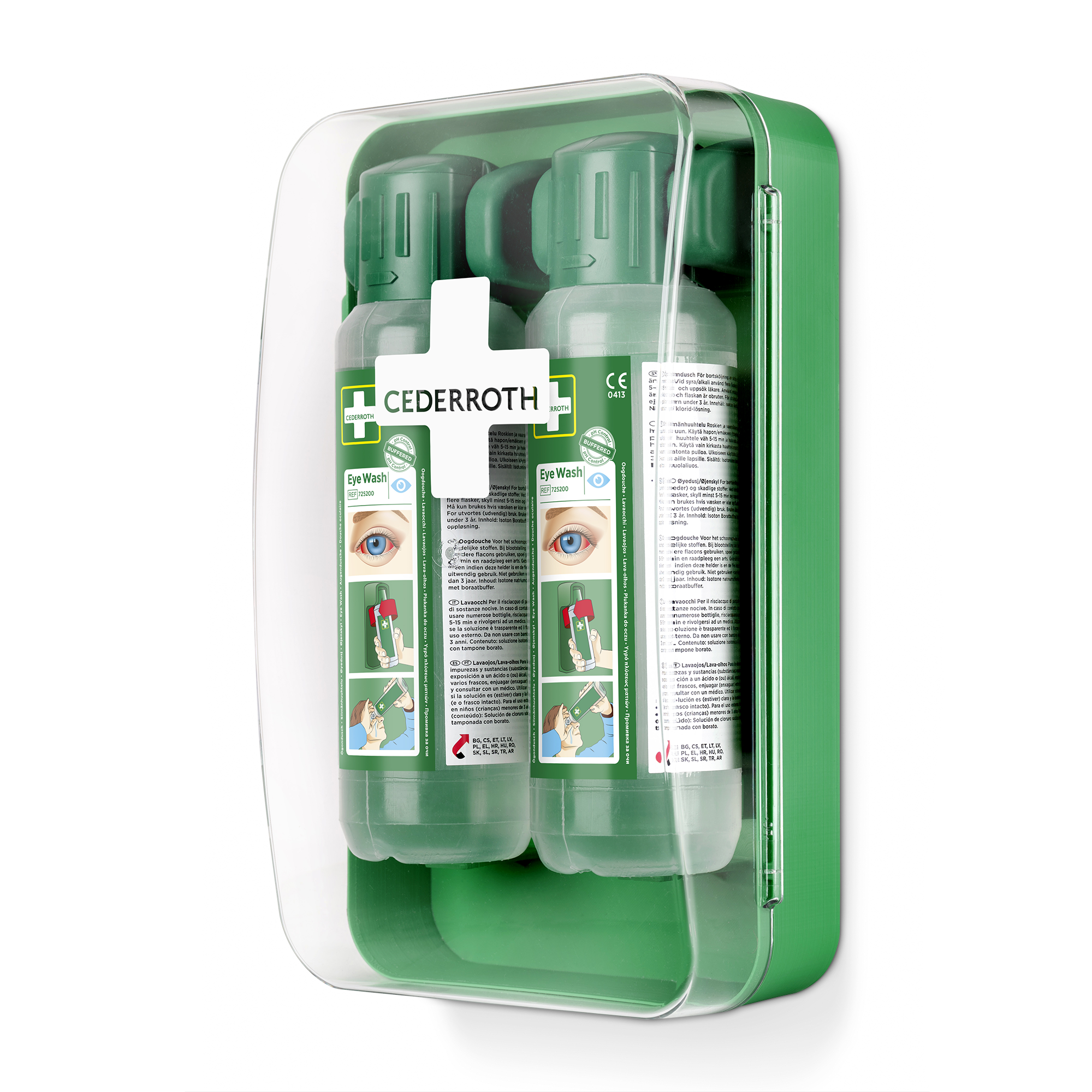 A compact eye wash cabinet that protects against dust and water. Includes 2 bottles of Cederroth Eye Wash. Easy to fit even in small spaces. Transparent lid for high visibility. Bottles will open automatically when twisted out of the brackets to enable immediate rinsing. Contains: 2 Cederroth Eye Wash Bottles à 500 ml (REF 725200), 1 Instructions sign. From the summer of 2025, the plastic in Cederroth Eye Wash Cabinets will be made of >78% recycled plastic.