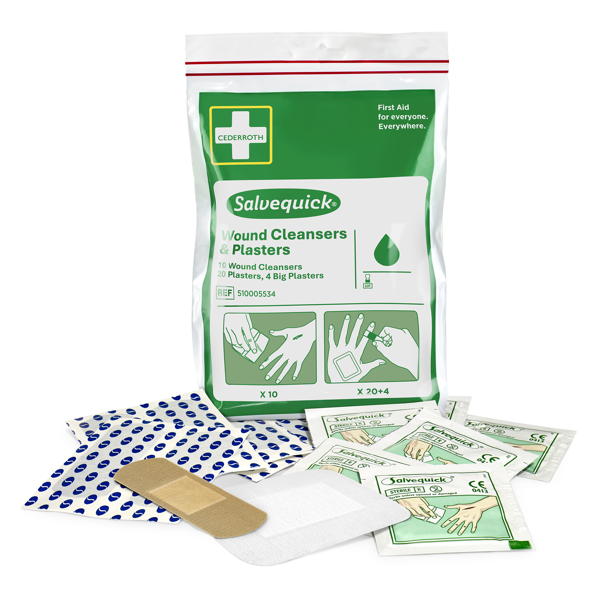 Practical bag with Salvequick Plasters (20 pcs), Salvequick Wound Cleansers (10 pcs) & Large Plasters (4 pcs).