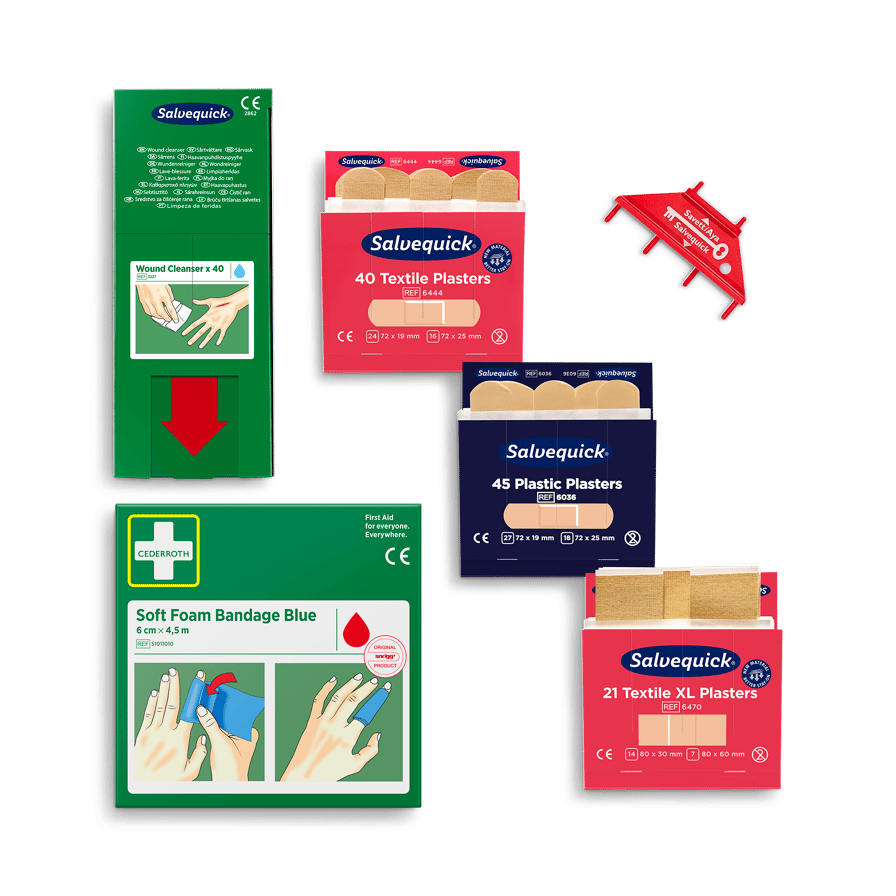 Cederroth Refill Pack for Wound Care Dispenser contains a complete set of refills for Wound Care Dispenser (REF 51011005). Contents: 1 x refill (45) Salvequick Plastic Plaster (REF 6036), 1 x refill (40) Salvequick Textile Plaster (REF 6444), 1 x refill (21) Salvequick XL Textile Plaster (REF 6470), 1 x box (40) Salvequick Wound Cleanser (REF 3227), 1 x Cederroth Soft Foam Bandage Blue 6cm x 4.5m (REF 51011010), 1 x Refill key.