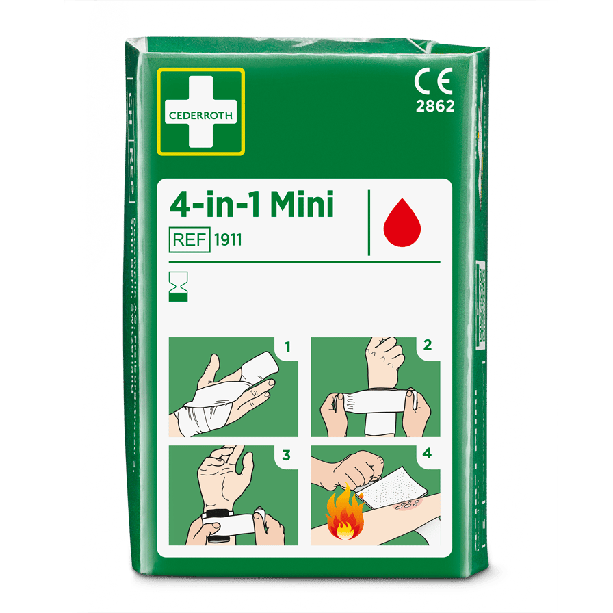 Cederroth 4-in-1 Bloodstopper is a small, flexible sterile First Aid dressing especially suitable for injuries to fingers and toes. Contents: 1 pad (8 x 12 cm), 1 elastic bandage (6 cm x 3 m). Clear colour illustrations and instructions are printed directly onto packaging.