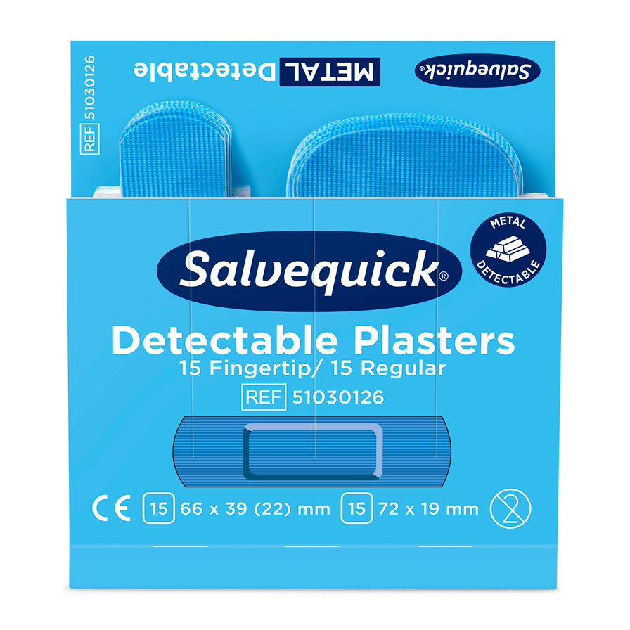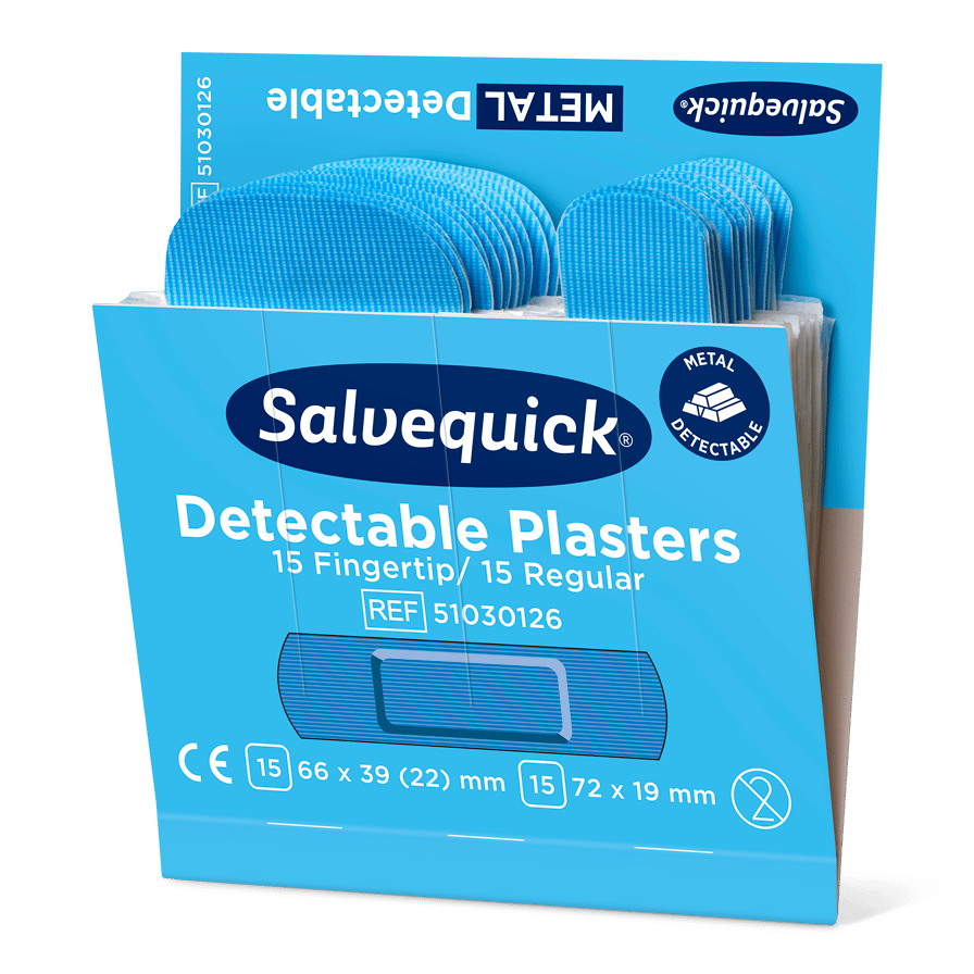 Salvequick Blue Detectable Plaster Fingertip/Regular is specially designed for use in the food industry. The plaster is easy to see and can be detected by most metal detectors. The blue colour makes the plaster easy to detect visually. The plaster is easy to apply, flexible and easy to use. Salvequick Blue Detectable Plaster Fingertip/Regular refills fit in Salvequick Plaster Dispenser and Wound Care Dispenser. Salvequick Plasters and Plaster Dispensers are a complete and easy-to-use system. Contents: Each refill contains 30 plasters (15 pcs 72×19 mm, 15 pcs 66×39 mm). 6 refill/box.