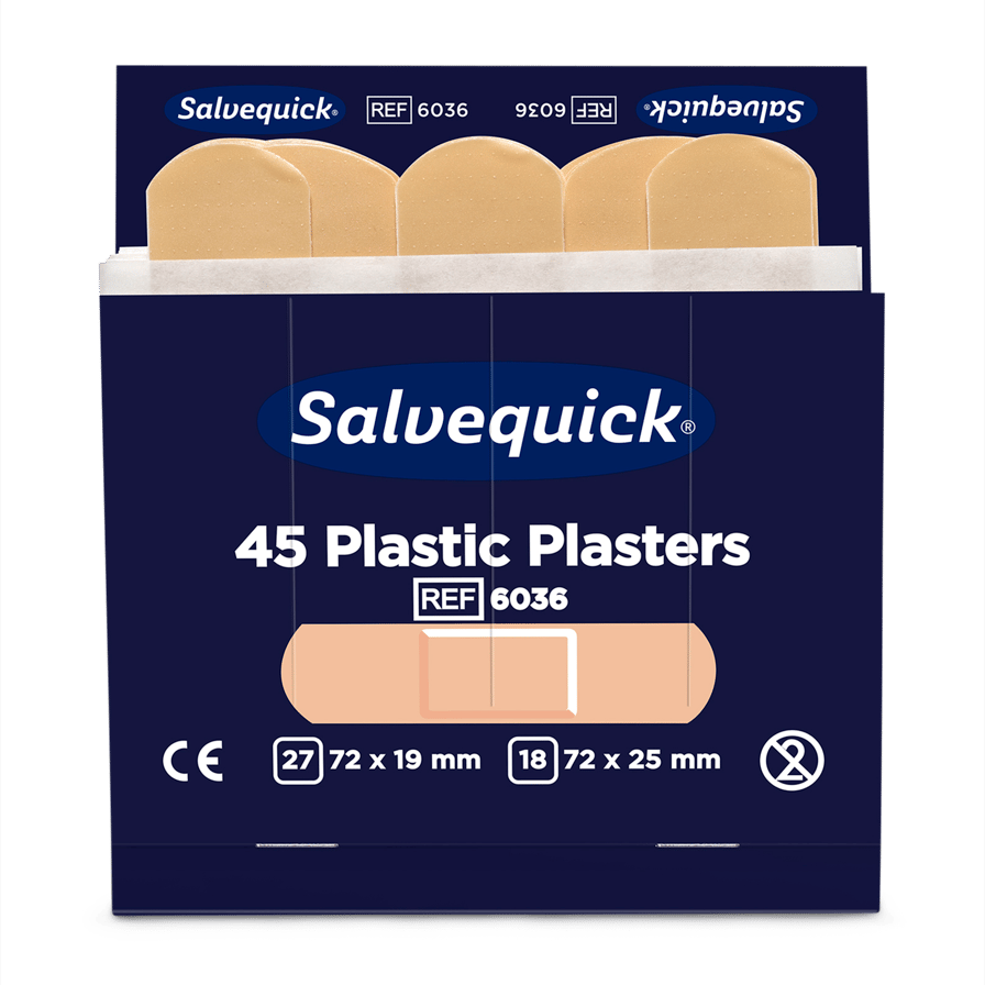 Salvequick Plastic Plaster refills fit in Salvequick Plaster Dispensers. Salvequick Plasters and Plaster Dispensers are a complete and easy-to-use system. The plasters are always to hand, ready to use. The refills are locked away in the dispensers to prevent waste. The dispenser can be restocked quickly and easily with the aid of a special key. Salvequick Plastic Plasters are flexible plasters of high quality, they are easy to apply, flexible and easy to use. Contents: Each refill contains 45 plasters (27 pcs 72x19mm and 18 pcs 72x25mm). 6 refills/box.