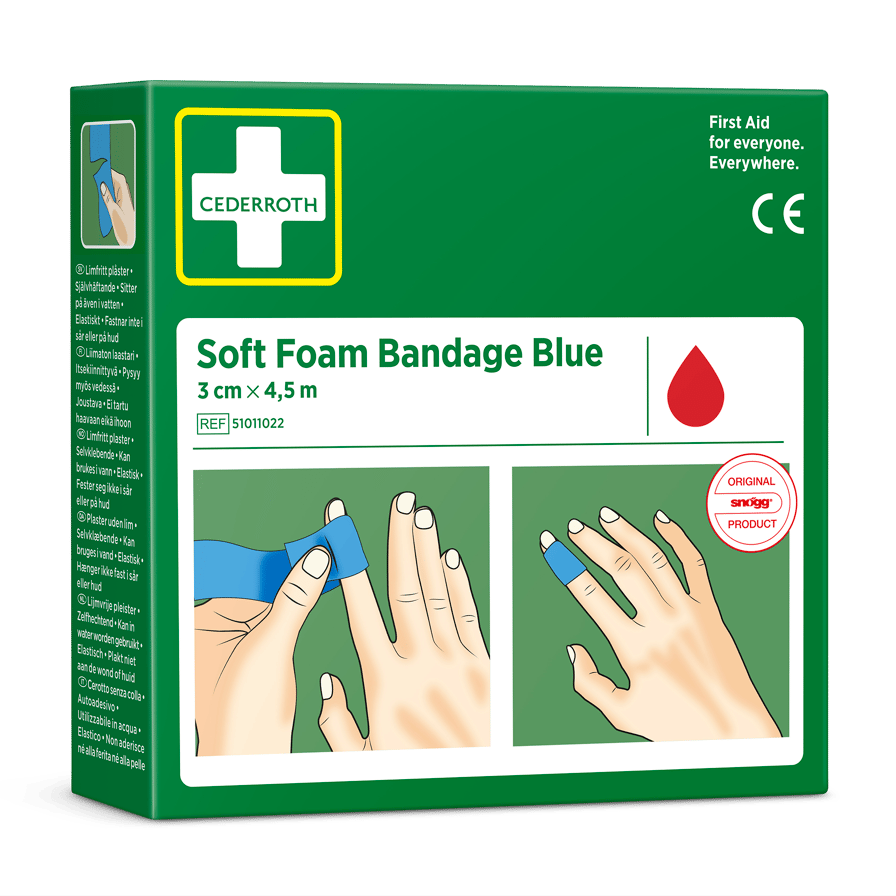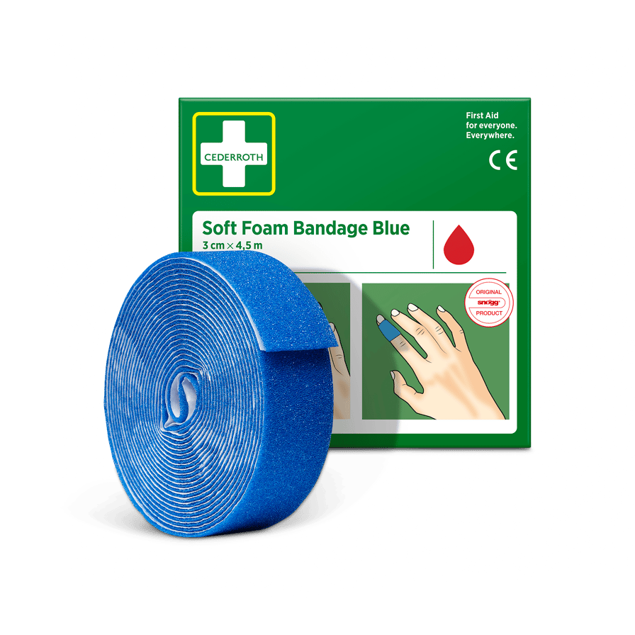 Cederroth Soft Foam Bandage Blue 3 cm x 4.5 m perfectly suited for fingers or toes. Easy to wind around small hands or when you have a small wound. It functions as both a plaster and as a bandage. The dressing is suitable for all types of small wounds regardless of heat, cold, wet or dry and will even stay on in water. Cederroth Soft Foam Bandage is a self-adherent, adhesive-free plaster and therefore does not stick to the skin or hair. Simply tear off a suitable piece and wind around the injured area. Cederroth Soft Foam Bandage is ideal for quick and easy wound care. The blue colour is highly visible and is suitable for use in food handling. Suitable as refill for Soft Foam Bandage 2-in-1 Dispenser (REF 510004108).