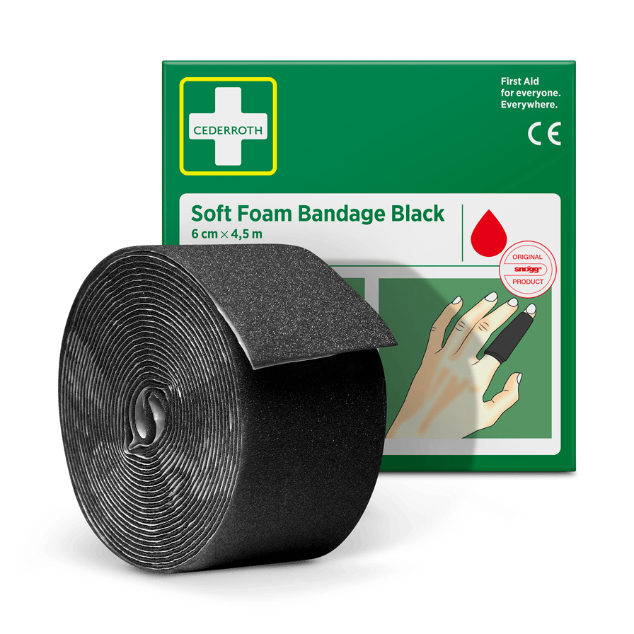 Cederroth Soft Foam Bandage Black 6 cm x 4.5 m functions as both a plaster and a bandage and is suitable for minor wounds. Easy to apply to fingers, hands, arms, toes, feet, legs and more. The dressing is suitable for all types of small wounds regardless of heat, cold, wet or dry and will even stay on in water. Cederroth Soft Foam Bandage is a self-adherent, adhesive-free plaster and therefore does not stick to the skin or hair. Simply tear off a suitable piece and wind around the injured area. In the case of heavy bleeding, shape a piece of Soft Foam Bandage into a cushion to create a pressure pad. Cederroth Soft Foam Bandage is ideal for quick and easy wound care. Black colour is recommended for dirty work environments as it camouflages stains on the outside of the dressing. Suitable as refill for Wound Care Dispenser (REF 51011009 & 51011006) and Cederroth Soft Foam Bandage 2-in-1 Dispenser (REF 510004108).
