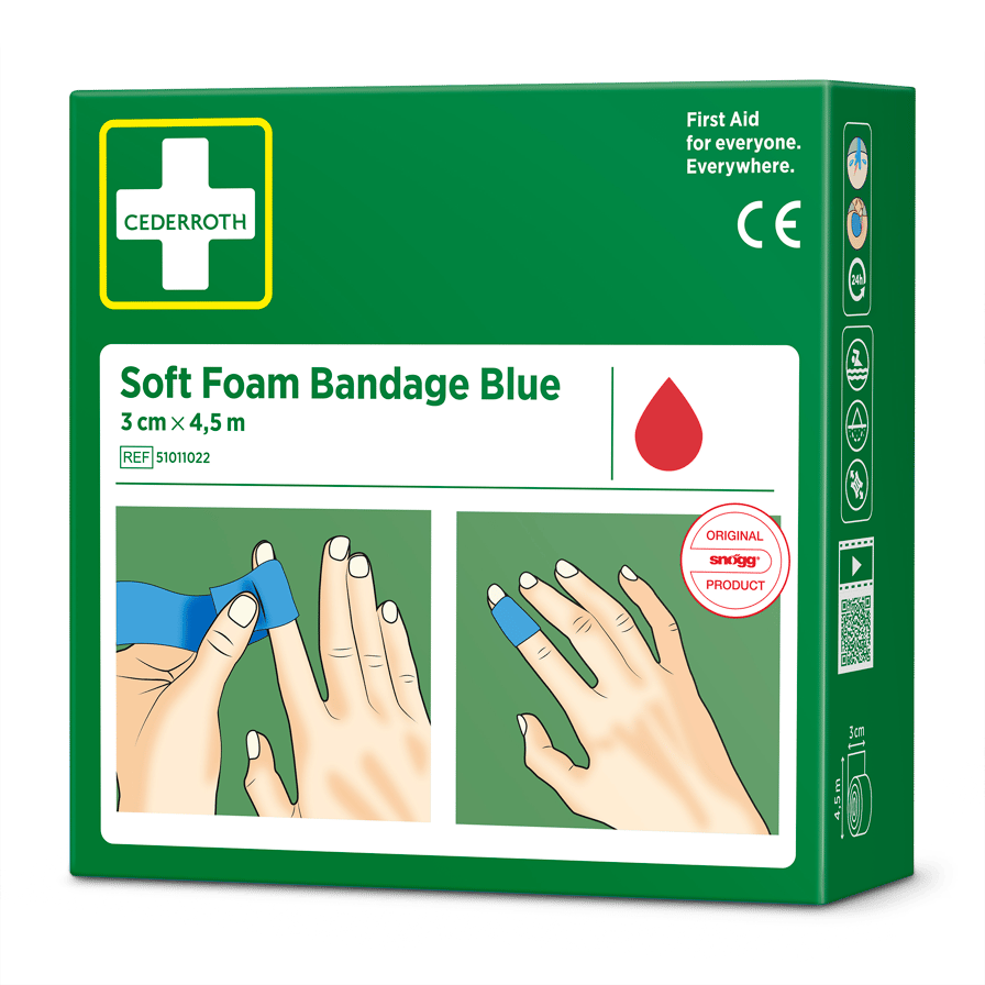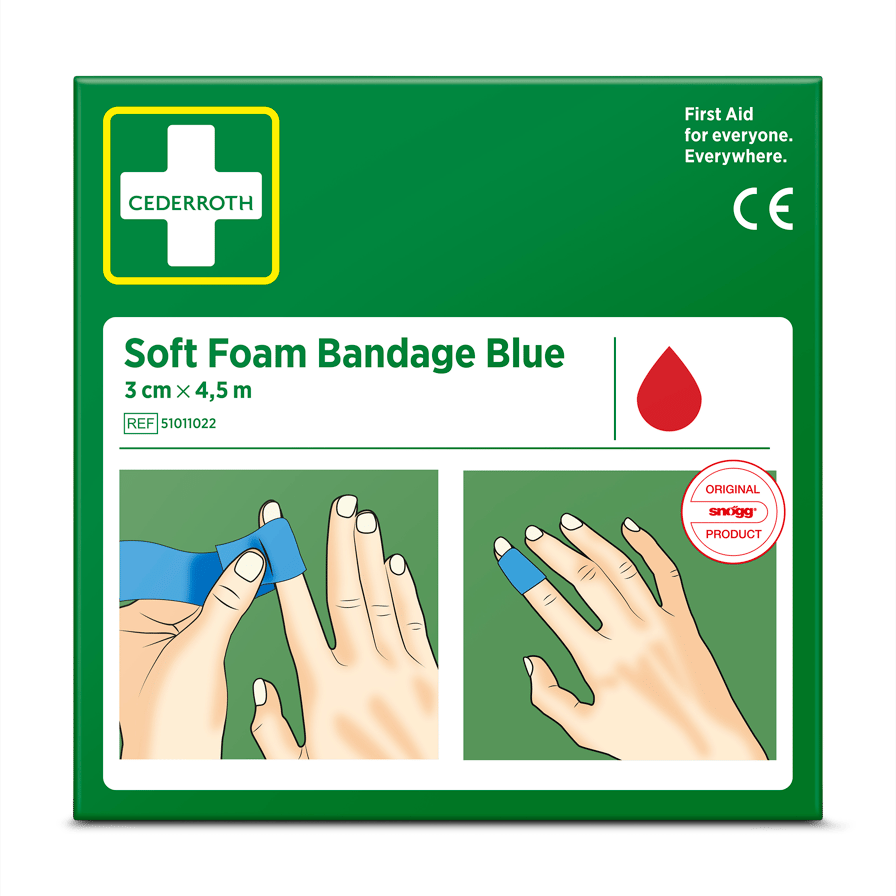 Cederroth Soft Foam Bandage Blue 3 cm x 4.5 m perfectly suited for fingers or toes. Easy to wind around small hands or when you have a small wound. It functions as both a plaster and as a bandage. The dressing is suitable for all types of small wounds regardless of heat, cold, wet or dry and will even stay on in water. Cederroth Soft Foam Bandage is a self-adherent, adhesive-free plaster and therefore does not stick to the skin or hair. Simply tear off a suitable piece and wind around the injured area. Cederroth Soft Foam Bandage is ideal for quick and easy wound care. The blue colour is highly visible and is suitable for use in food handling. Suitable as refill for Soft Foam Bandage 2-in-1 Dispenser (REF 510004108).