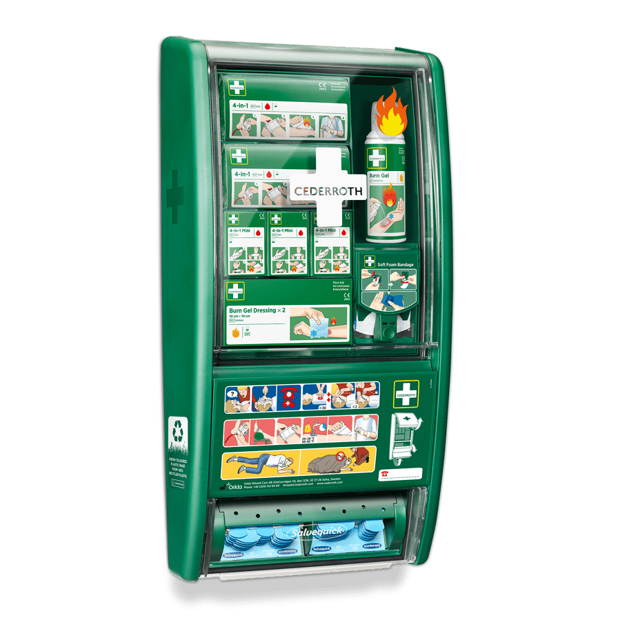 The First Aid Station for workplaces with risk of burn injuries and/or where food is processed, such as catering kitchens, the food industry and workshops. With Cederroth Burn Gel 100ml Contains Soft Foam Blue, a self-adherent, adhesive-free plaster that stays in place even in water. Blue detectable plasters and burn injury products in the form of pads, sprays and plasters. Contents: 2 Cederroth 4-in-1 Bloodstoppers (REF 1910). 3 Cederroth 4-in-1 Mini Bloodstoppers (REF 1911). 2 (x 2) Cederroth Burn Gel Dressings (REF 901900). 1 Cederroth Burn Gel, 100 ml (REF 51011005). 1 Cederroth Soft Foam Dispenser incl. Soft Foam Blue 2 metres x 6 cm (REF 51011011). 1 box Burn Cover, 10 pcs (REF 901903). 1 Salvequick Plaster Dispenser incl. Blue Detectable Plasters, 35 regular (REF 51030127), and 30 regular/fingertip (REF 51030126). 1 (x 20) Salvequick Wound Cleanser (REF 323700). 1 Breathing Mask (REF 1921). 1 First Aid instructions. 1 Refill key. 1 Drilling template. From the summer of 2025, the plastic in Cederroth First Aid Stations and Dispensers will be made of >92% recycled plastic.