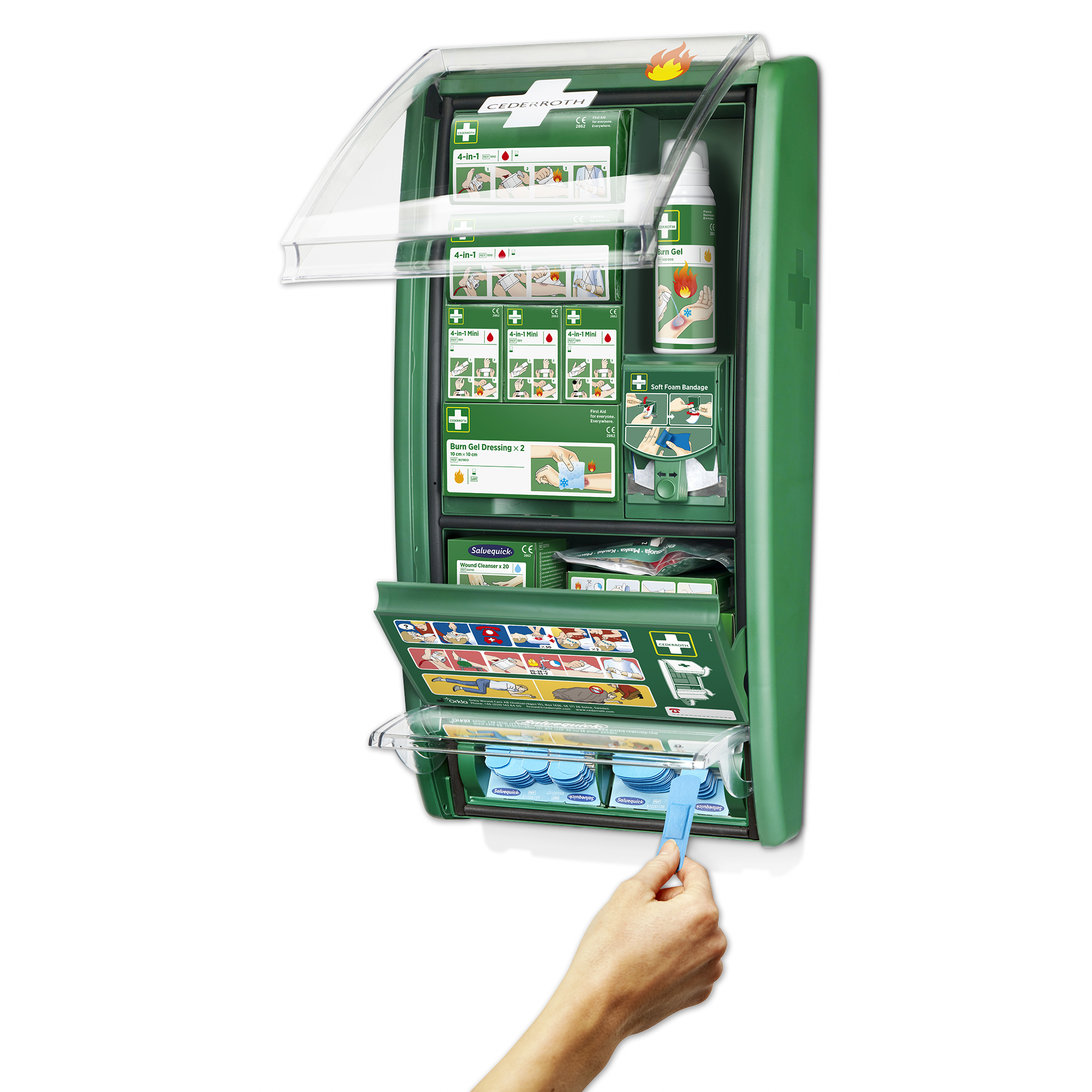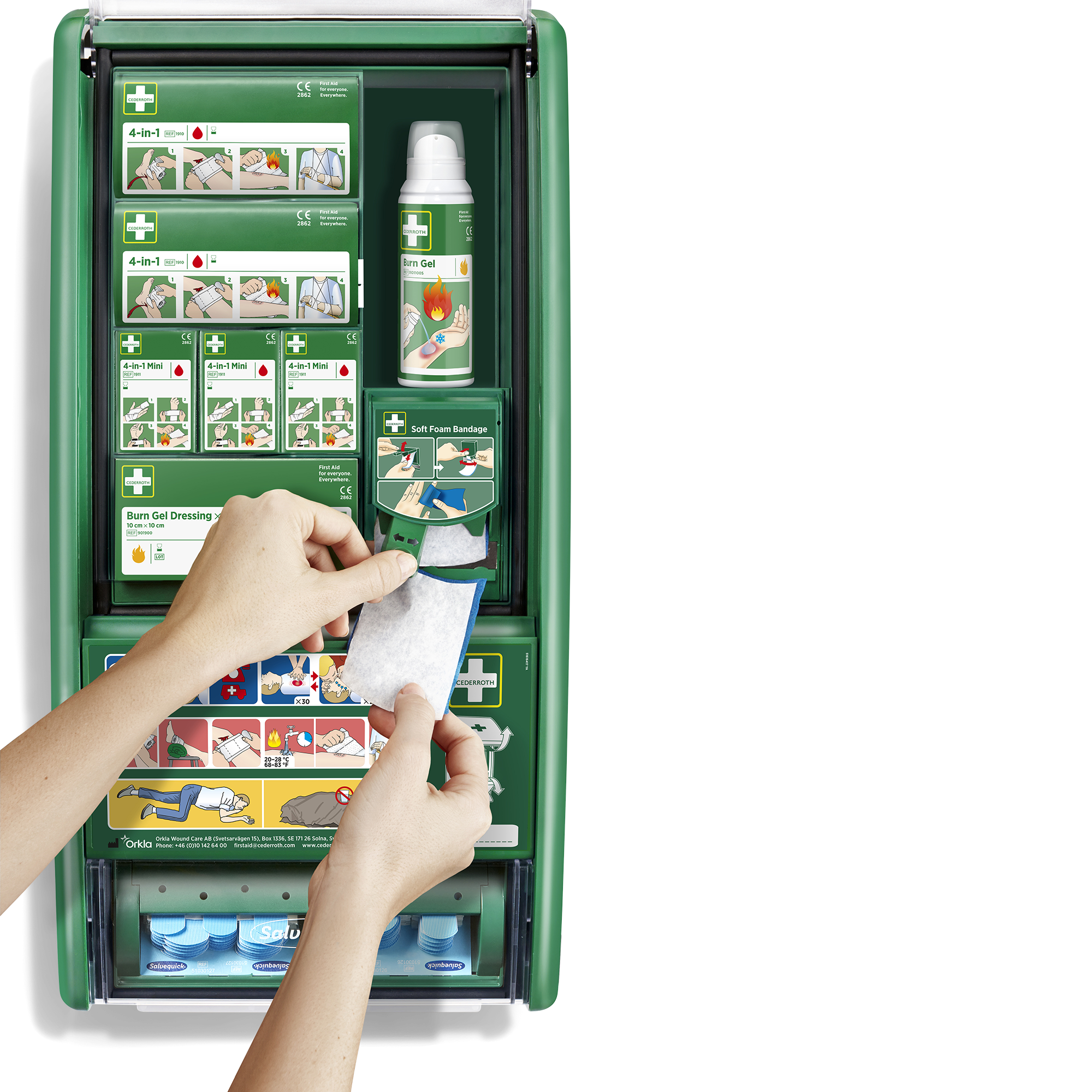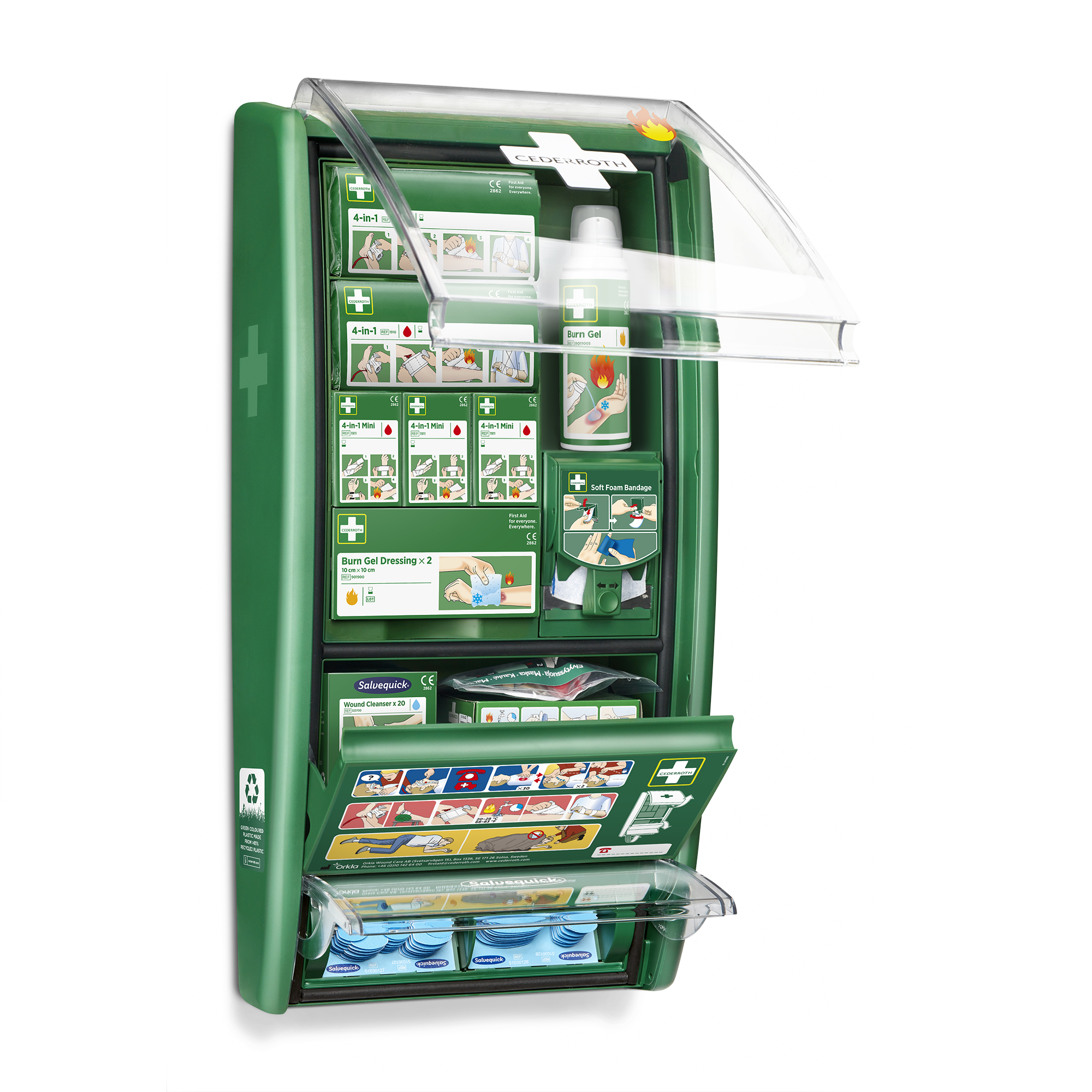 The First Aid Station for workplaces with risk of burn injuries and/or where food is processed, such as catering kitchens, the food industry and workshops. With Cederroth Burn Gel 100ml Contains Soft Foam Blue, a self-adherent, adhesive-free plaster that stays in place even in water. Blue detectable plasters and burn injury products in the form of pads, sprays and plasters. Contents: 2 Cederroth 4-in-1 Bloodstoppers (REF 1910). 3 Cederroth 4-in-1 Mini Bloodstoppers (REF 1911). 2 (x 2) Cederroth Burn Gel Dressings (REF 901900). 1 Cederroth Burn Gel, 100 ml (REF 51011005). 1 Cederroth Soft Foam Dispenser incl. Soft Foam Blue 2 metres x 6 cm (REF 51011011). 1 box Burn Cover, 10 pcs (REF 901903). 1 Salvequick Plaster Dispenser incl. Blue Detectable Plasters, 35 regular (REF 51030127), and 30 regular/fingertip (REF 51030126). 1 (x 20) Salvequick Wound Cleanser (REF 323700). 1 Breathing Mask (REF 1921). 1 First Aid instructions. 1 Refill key. 1 Drilling template. From the summer of 2025, the plastic in Cederroth First Aid Stations and Dispensers will be made of >92% recycled plastic.