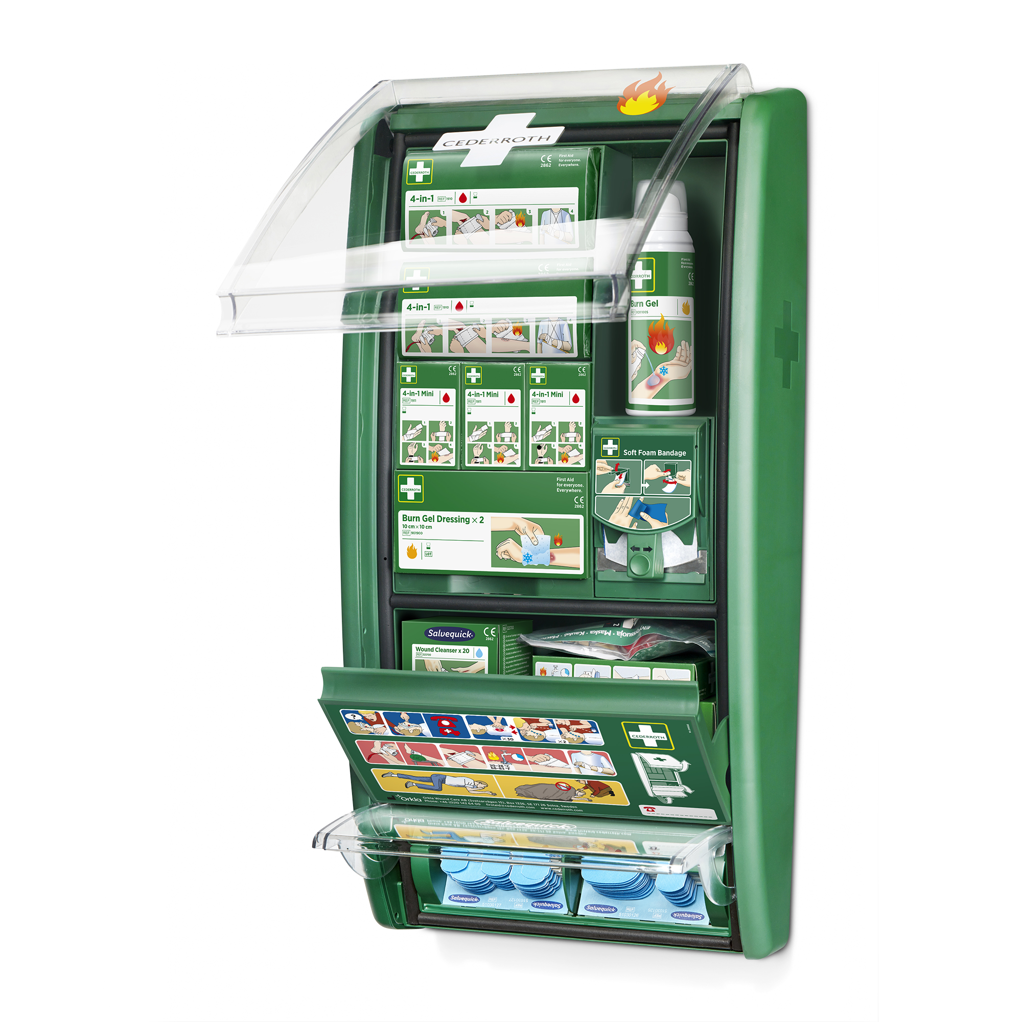 The First Aid Station for workplaces with risk of burn injuries and/or where food is processed. Contains Cederroth Burn Gel 100ml, Soft Foam Blue (a self-adherent, adhesive-free plaster that stays in place even in water), blue detectable plasters and burn injury products: pads, sprays and plasters.