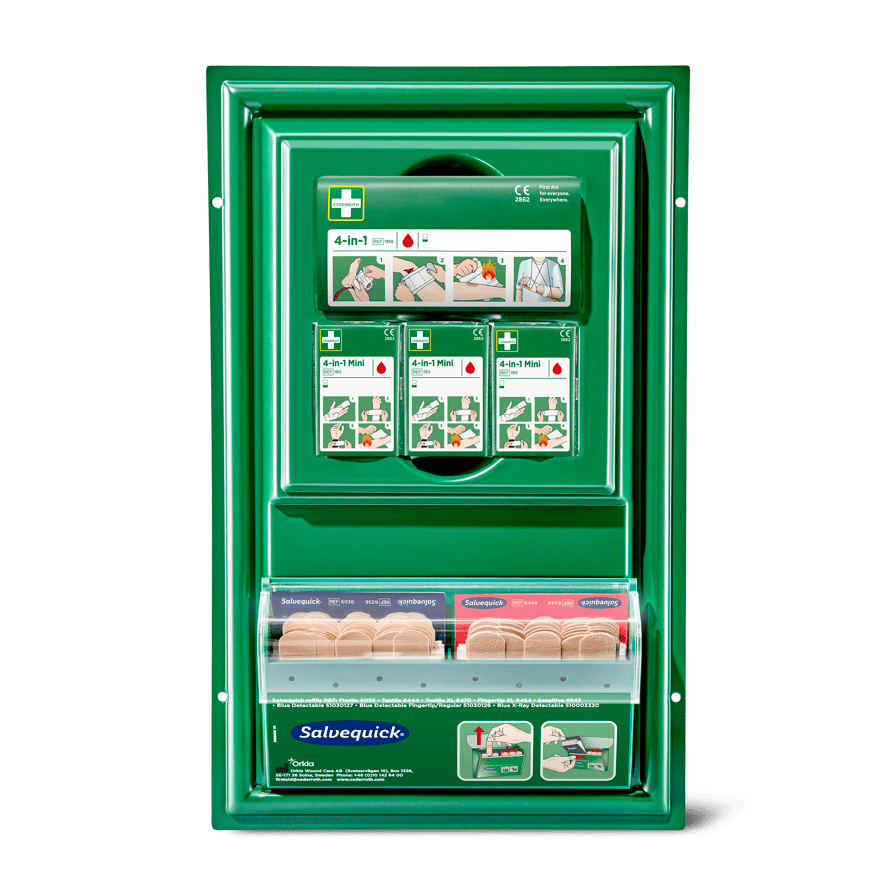 First Aid Panel Mini is a smaller panel with only plasters and Bloodstoppers. Suitable for small are as or to supplement other First Aid equipment. When the plaster is pulled out of the Plaster Dispenser, one adhesive surface is exposed and the plaster is ready to use. Contents: 1 Cederroth 4-in-1 Bloodstopper. 3 Cederroth 4-in-1 Mini Bloodstoppers. 1 Salvequick Plaster Dispenser.