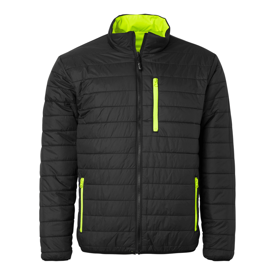 Reversible quilt lined jacket from Top Swede with two front zippered pockets. Strong water repellent and stretchy outer fabric. Can be worn as a high visibility jacket or black jacket, both sides have pockets. Perfect for work in construction and industry.