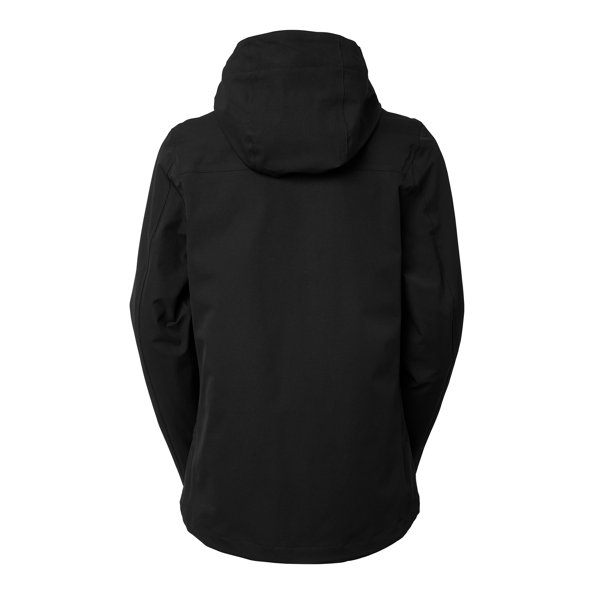 Wind and water repellent shell jacket in a vapor fit with taped seams and waterproof zipper with reflective detail. Soft material with mechanical stretch. Removable hood and adjustable cuffs. Two side pockets and one inner pocket with zipper.