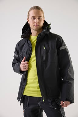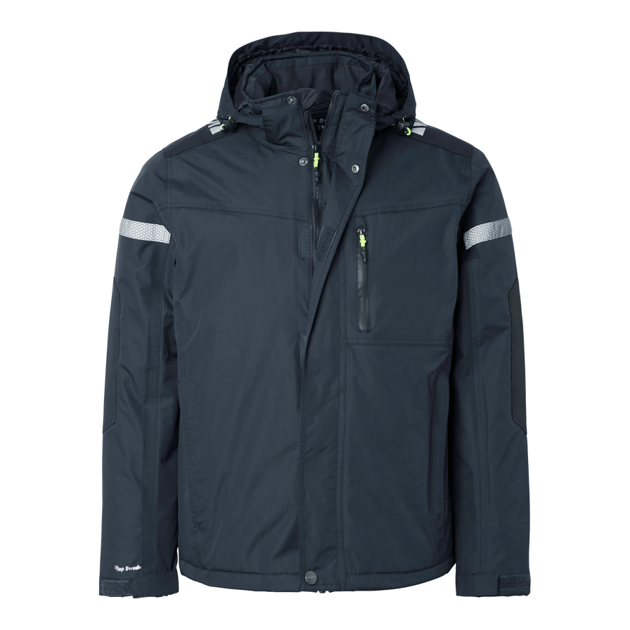 Discover the Top Swedes 350 Jacket, an ultimate winter jacket designed for construction and industrial professionals who need reliable protection against wind and water. Made from durable nylon, this jacket is wind and waterproof with taped seams for extra protection. The jacket is lined with quilting and has a back panel that adds increased warmth and ventilation, making it ideal for cold working days. Storage options include a chest pocket with waterproof zipper, an inner pocket/phone pocket and a large napoleon pocket under the lapel. The detachable lined hood provides extra protection from the elements, while reflective details increase visibility and safety. The jacket has side pockets with zippers, adjustable cuffs and hem and thumb grip cuffs for optimal fit and comfort. Choose the 350 Jacket for a combination of durability, functionality and comfort that meets the highest standards in workwear.