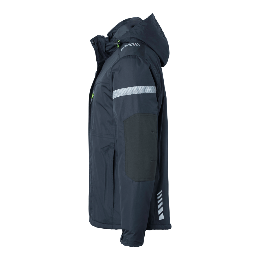 Windproof and waterproof winter jacket with taped seams, lined with quilt and materials that provide warmth and ventilation. Chest pocket with waterproof zipper, inner pocket, napoleon pocket and side pockets with zippers. Detachable hood, reflective details, adjustable cuffs and hem.