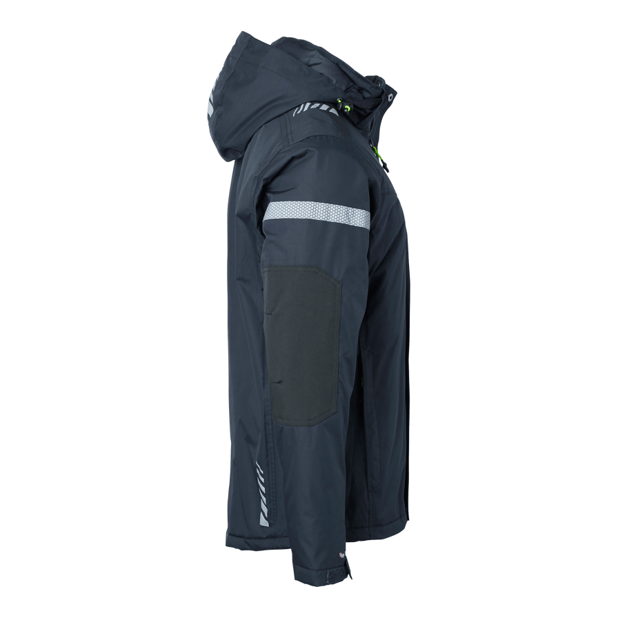 Windproof and waterproof winter jacket with taped seams, lined with quilt and materials that provide warmth and ventilation. Chest pocket with waterproof zipper, inner pocket, napoleon pocket and side pockets with zippers. Detachable hood, reflective details, adjustable cuffs and hem.