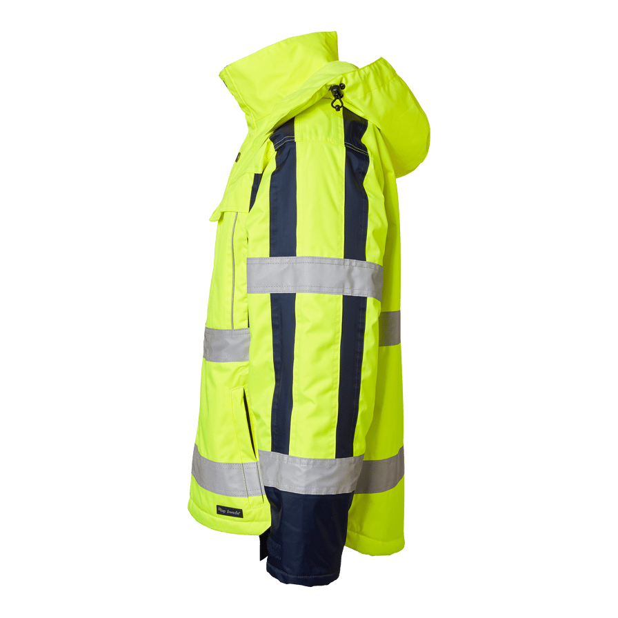 Wind and waterproof jacket with taped seams and good breathability. Lined with quilt and fleece in the collar. Equipped with several pockets, adjustable hood and cuffs and drawstring at the bottom. Perfect for working in all weather conditions.