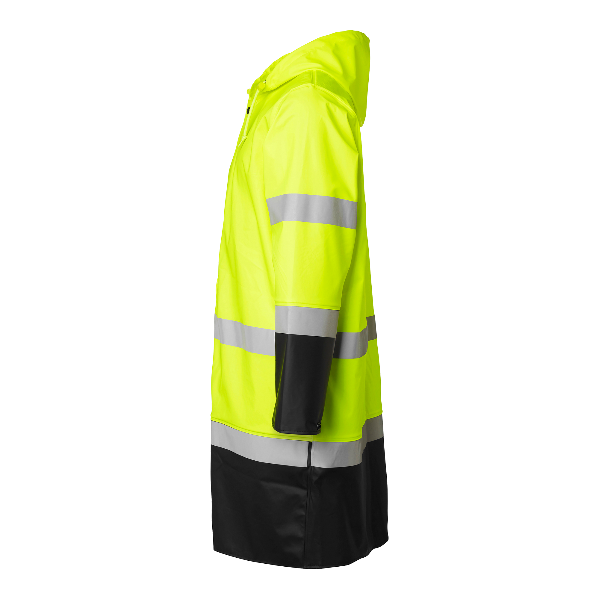 Raincoat in stretch material with welded seams. Zipper with punch and press studs. Hood with drawstring, adjustable cuffs. Length 100 cm for extra protection.