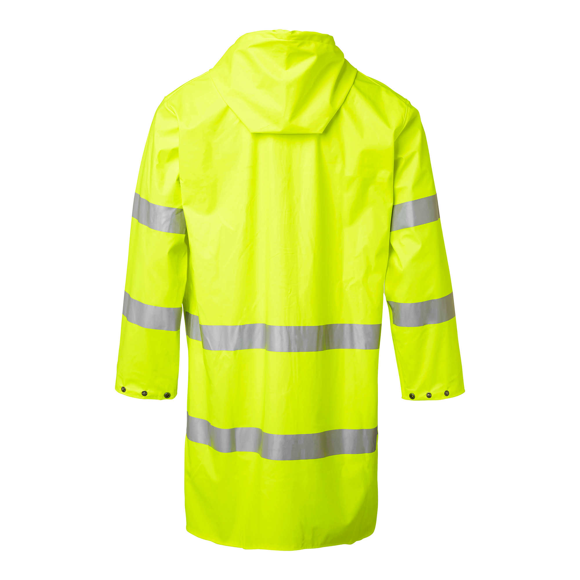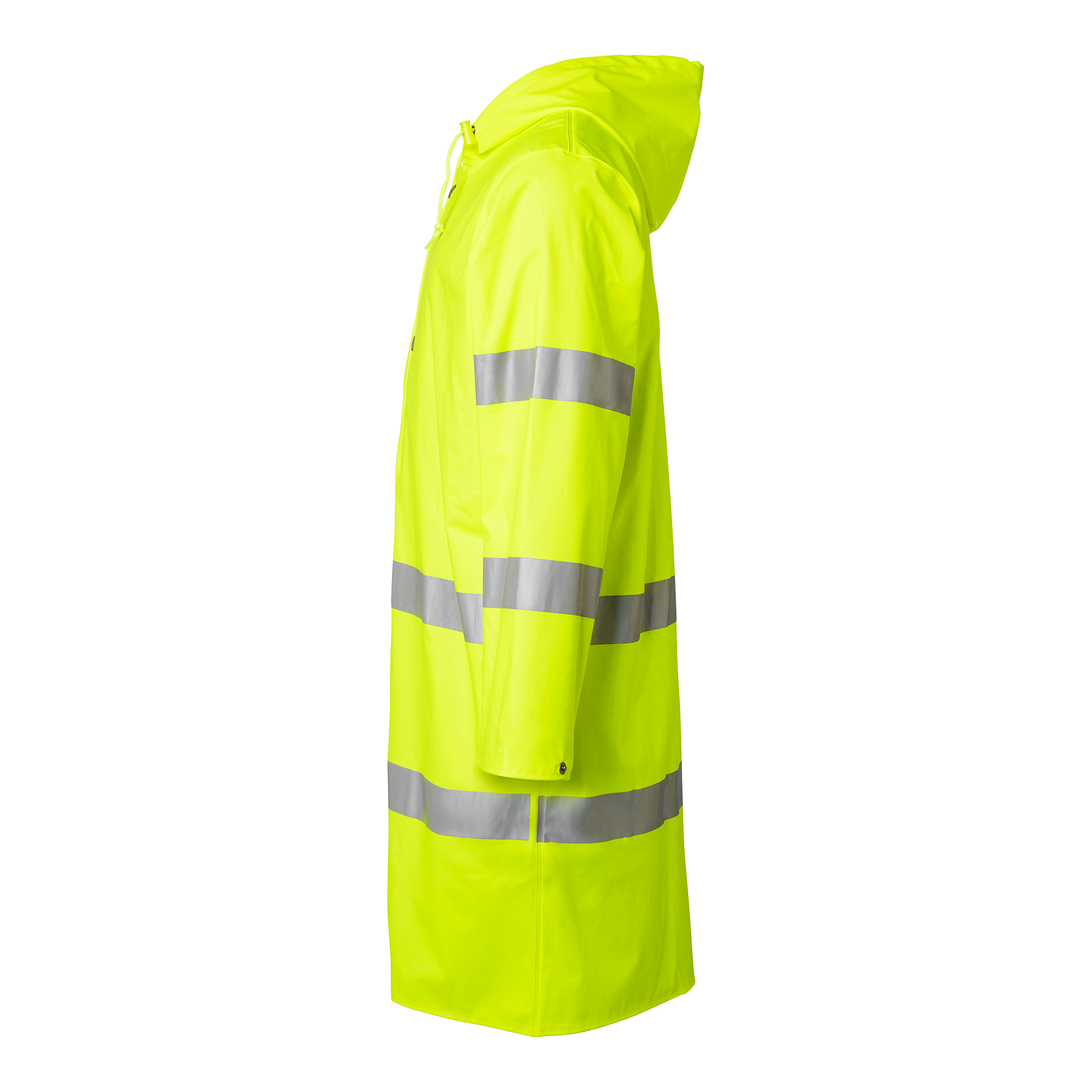 Warning raincoat 100 cm in smooth stretch fabric with welded seams. Zipper with flap and press studs, hood with drawstring, and adjustable cuffs for optimal fit and visibility in rainy conditions.