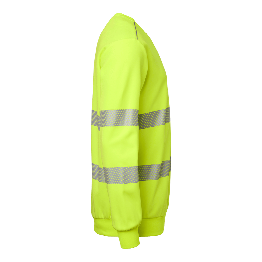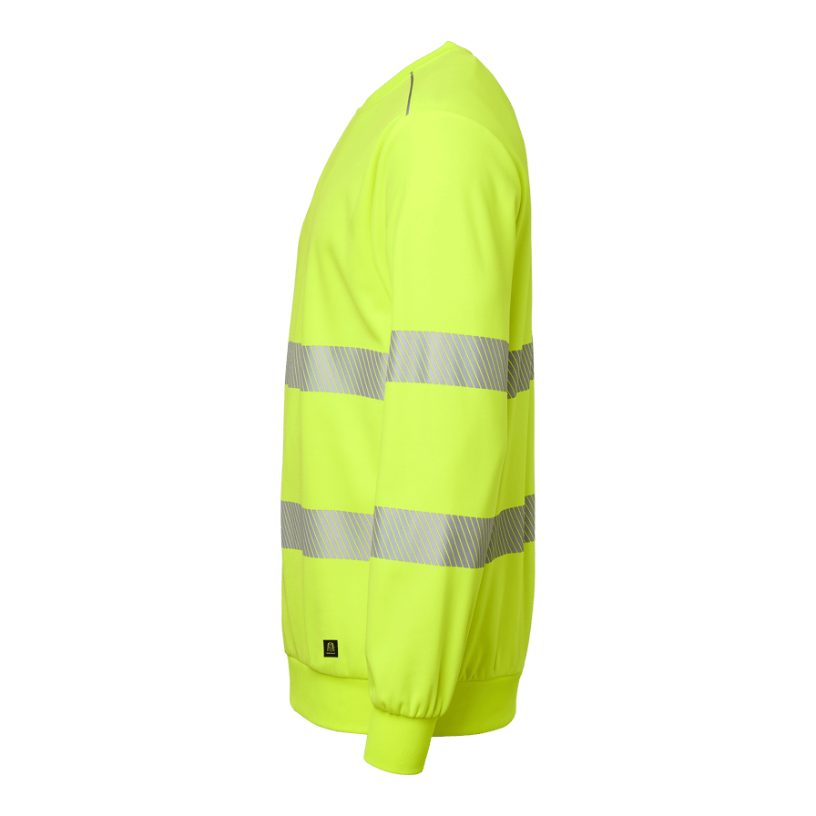 High-visibility sweatshirt with crew neck, segmented reflective details, and ribbed cuffs and hem. Made from recycled polyester for durability and comfort. Perfect for demanding work environments.