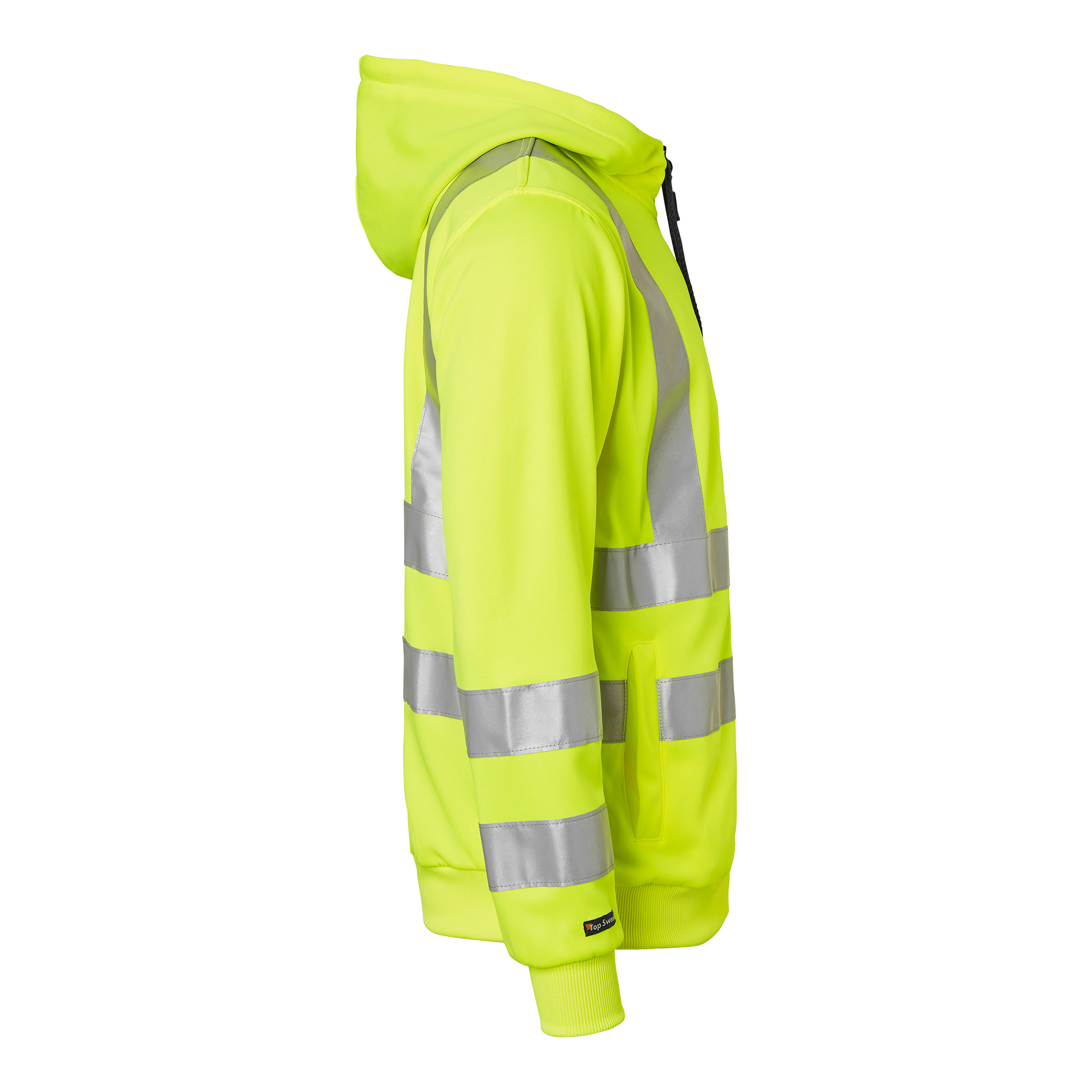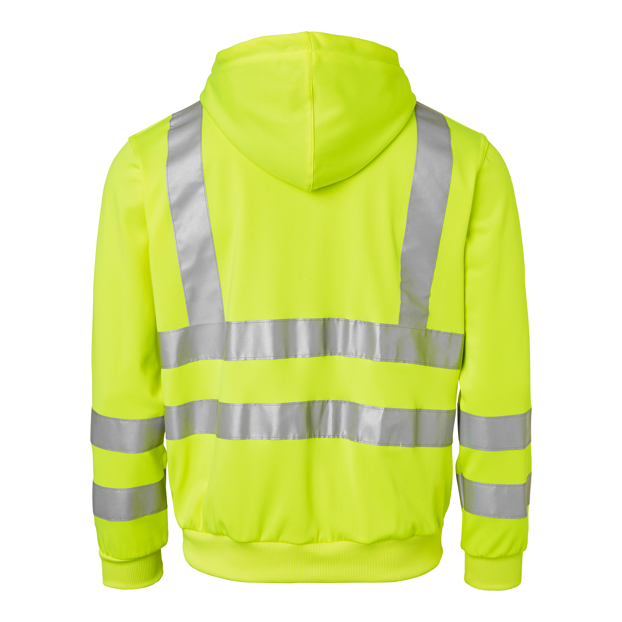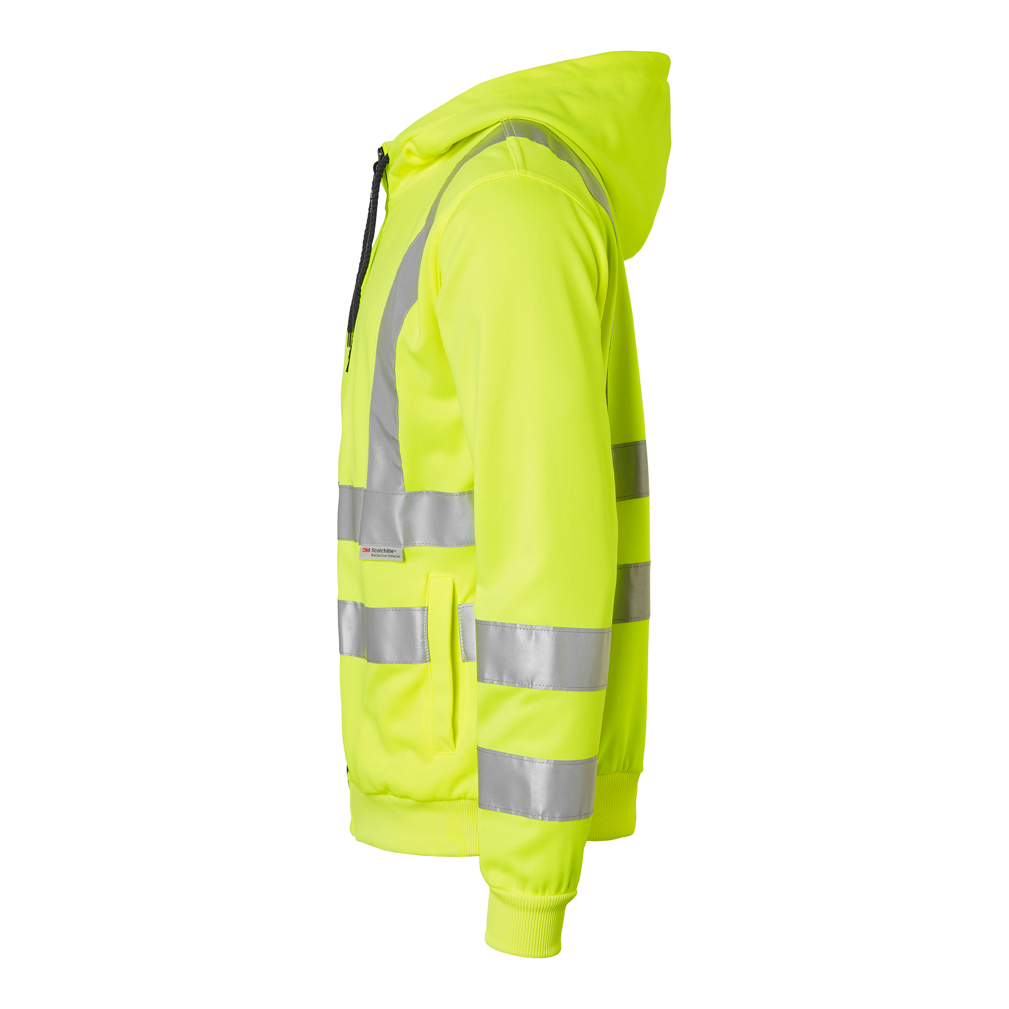 Hoodie with full zipper, two side pockets and cuffs and hem. Made of high visibility polyester. Ideal for work in demanding environments.